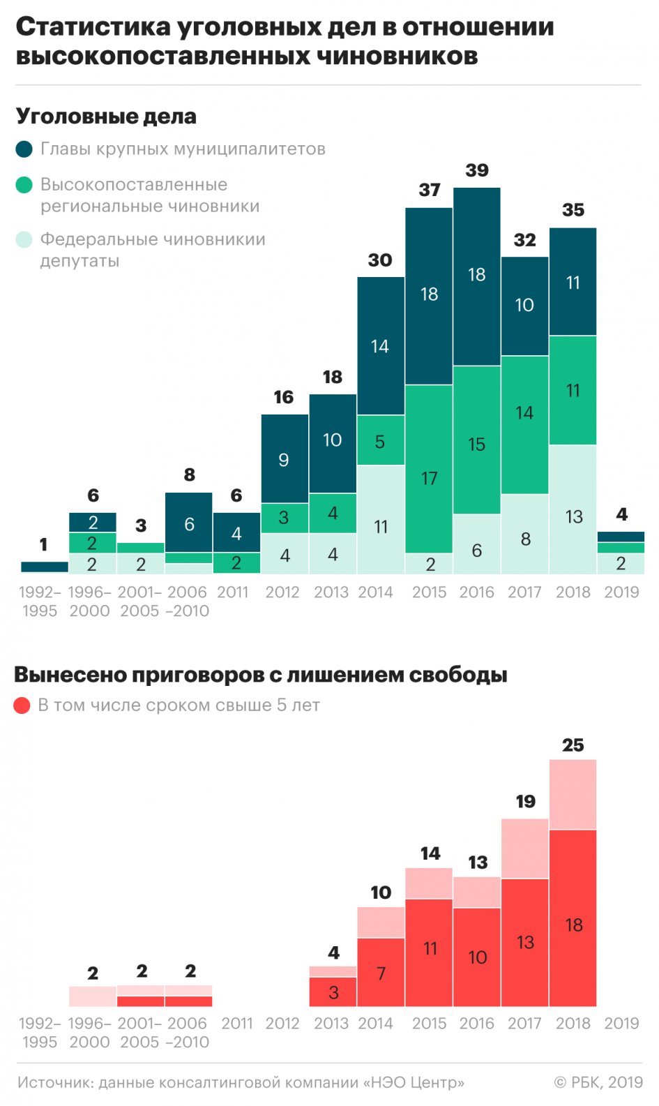 Если в 1990-е годы случаи арестов чиновников каждого из этих уровней были единичными, то на стыке 2000–2010-х годов число уголовных дел в их отношении кратно возросло. В 2012 году было возбуждено всего 16 дел, из них четыре в отношении федеральных чиновников. Далее ежегодно арестовывалось не менее 20 чиновников (в 2015 и 2018 годах был максимум — 37). Больше всего федеральных чиновников (13) было арестовано в 2018 году.