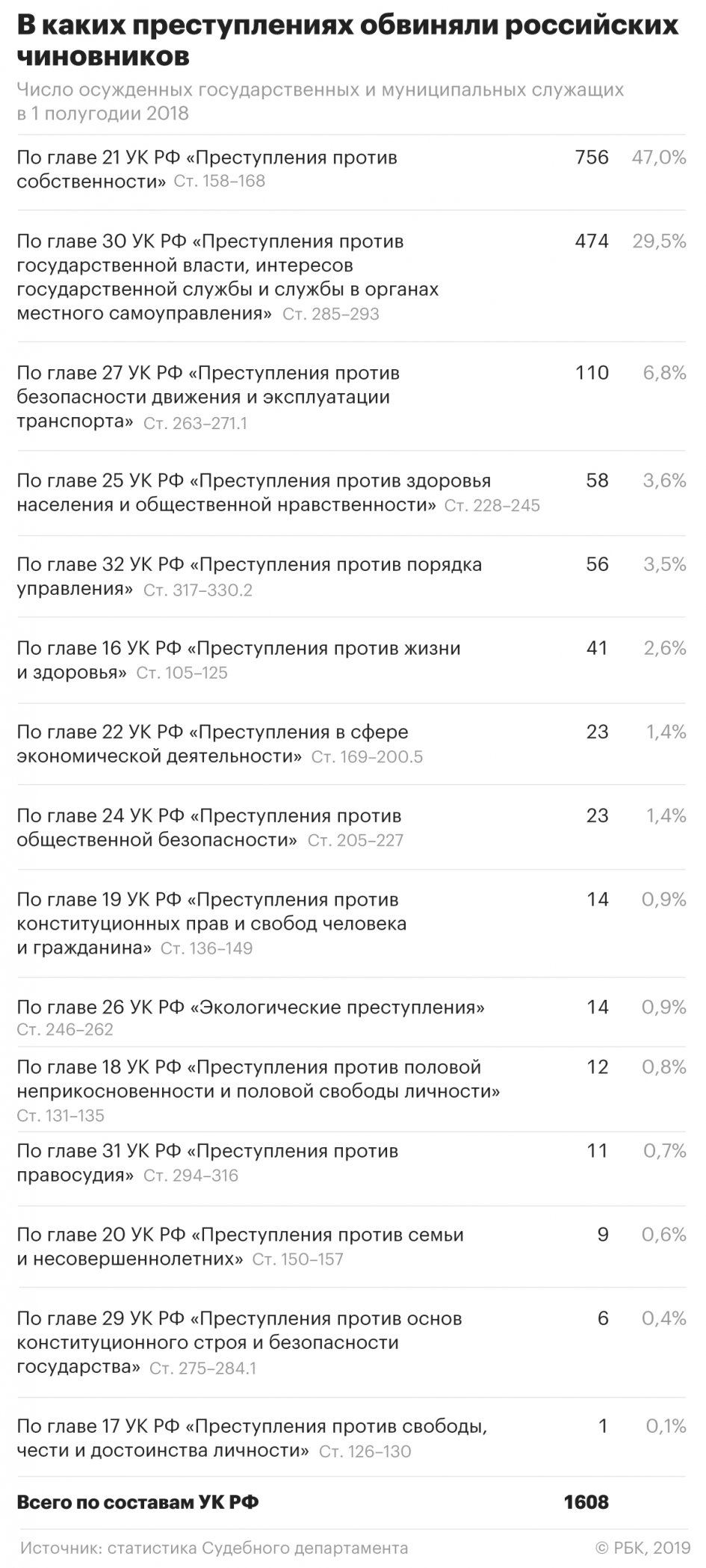 В первом полугодии 2018 года в России осудили 1608 чиновников — государственных и муниципальных служащих, свидетельствует статистика Судебного департамента при Верховном суде России. Самая популярная статья, по которой госслужащие получают судимость — мошенничество, на нее приходится более четверти всех осужденных, 436 человек (27%). Всего за разные преступления против собственности, к которым относится и мошенничество, осудили 756 человек (47%).