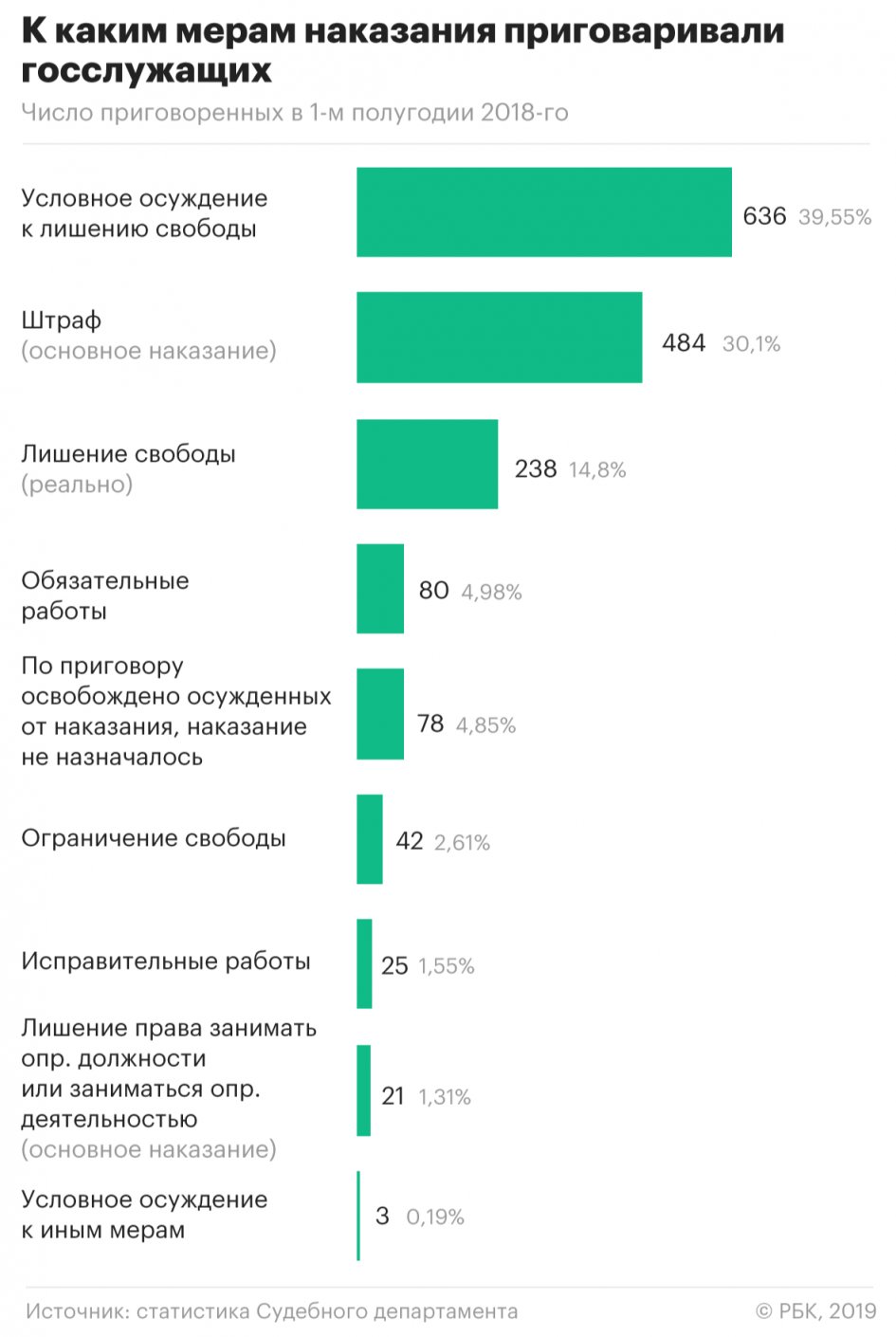 636 (40%) всех осужденных чиновников наказаны условным лишением свободы, еще 484 (30%) — оштрафованы.