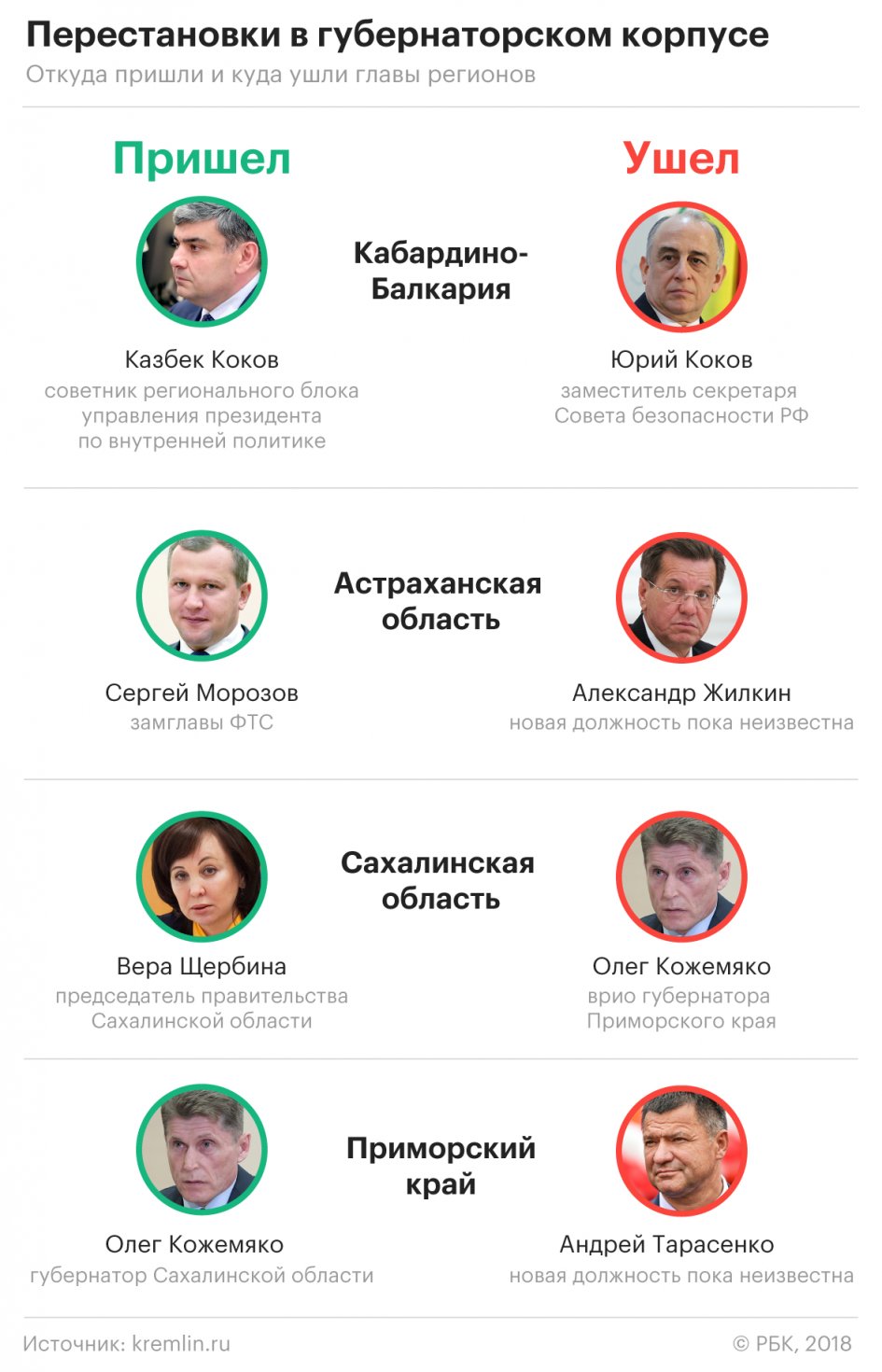Накануне, 26 сентября, президент Владимир Путин отправил в отставку главу Кабардино-Балкарии Юрия Кокова и губернатора Астраханской области Александра Жилкина. Кроме того, президент перевел губернатора Сахалинской области Олега Кожемяко в Приморье, где выборы главы были отменены из-за фальсификаций.