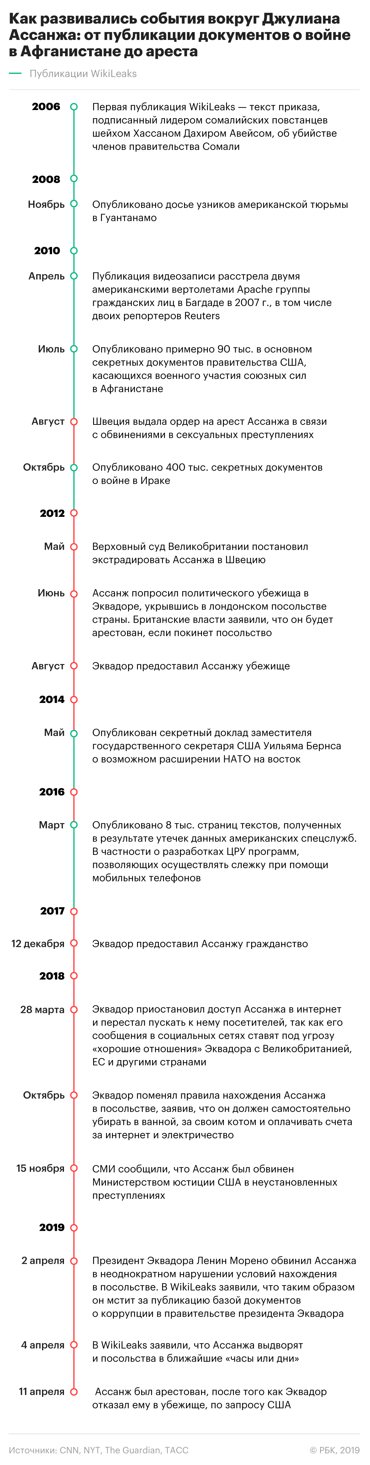 Ассанж создал интернет-ресурс WikiLeaks в 2006 году, разместив главный сервер сайта в Швеции, с целью публикации секретных и закрытых для общего доступа сведений, полученных от анонимных источников. Первым материалом сайта стал приказ лидера сомалийских повстанцев шейха Хассана Дахира Авейса об убийстве членов правительства Сомали, размещенный в 2006 году. Сейчас на сайте этого документа нет, и первая опубликованная «утечка» датируется сентябрем 2007 года и рассказывает о военной деятельности США в Афганистане.