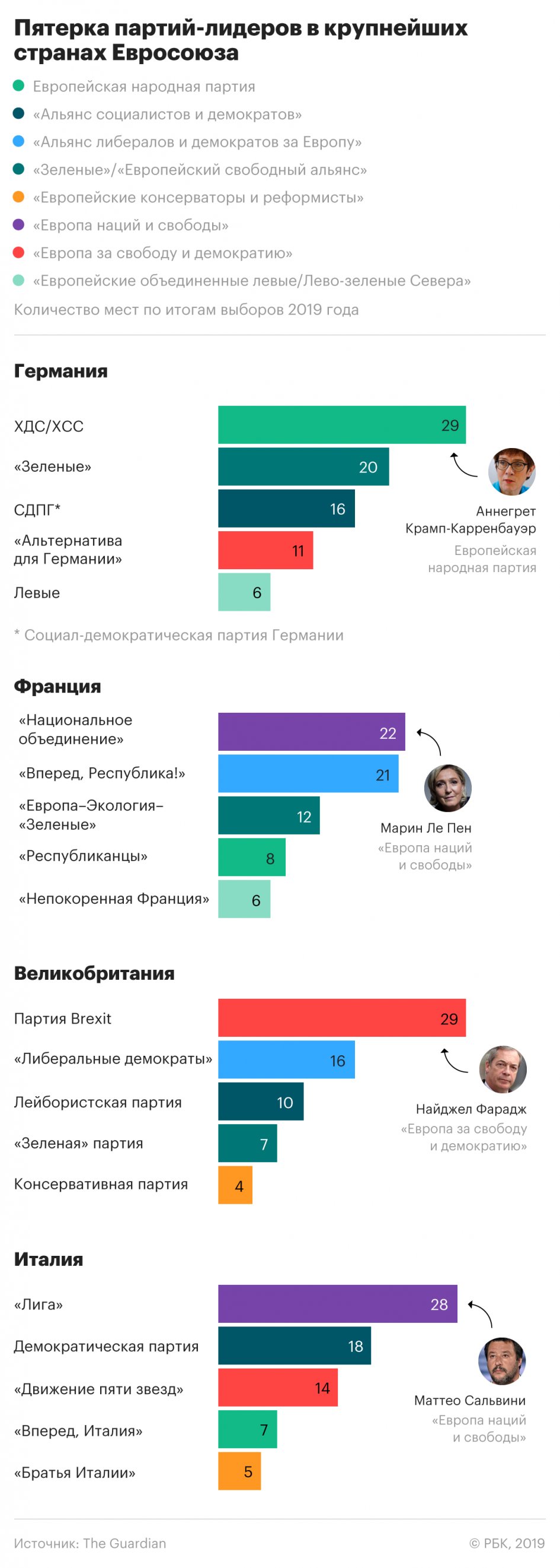 Итоги выборов в Европарламент оказались неудачными для правящей в стране коалиции, в которую входят правоцентристский блок Христианско-демократического и Христианско-социального союзов (ХДС/ХСС) и Социал-демократическая партия Германии (СДПГ). ХДС/ХСС, по предварительным данным, получил 28,9% голосов — на 7% меньше, чем в 2014 году. Выступление же социал-демократов оказалось еще более провальным — за них проголосовали 15,8% избирателей, что на 11,5% меньше, чем на прошлых выборах. Зато свой результат улучшили «зеленые», получившие 20,5% голосов, в два раза больше по сравнению с выступлением пять лет назад.