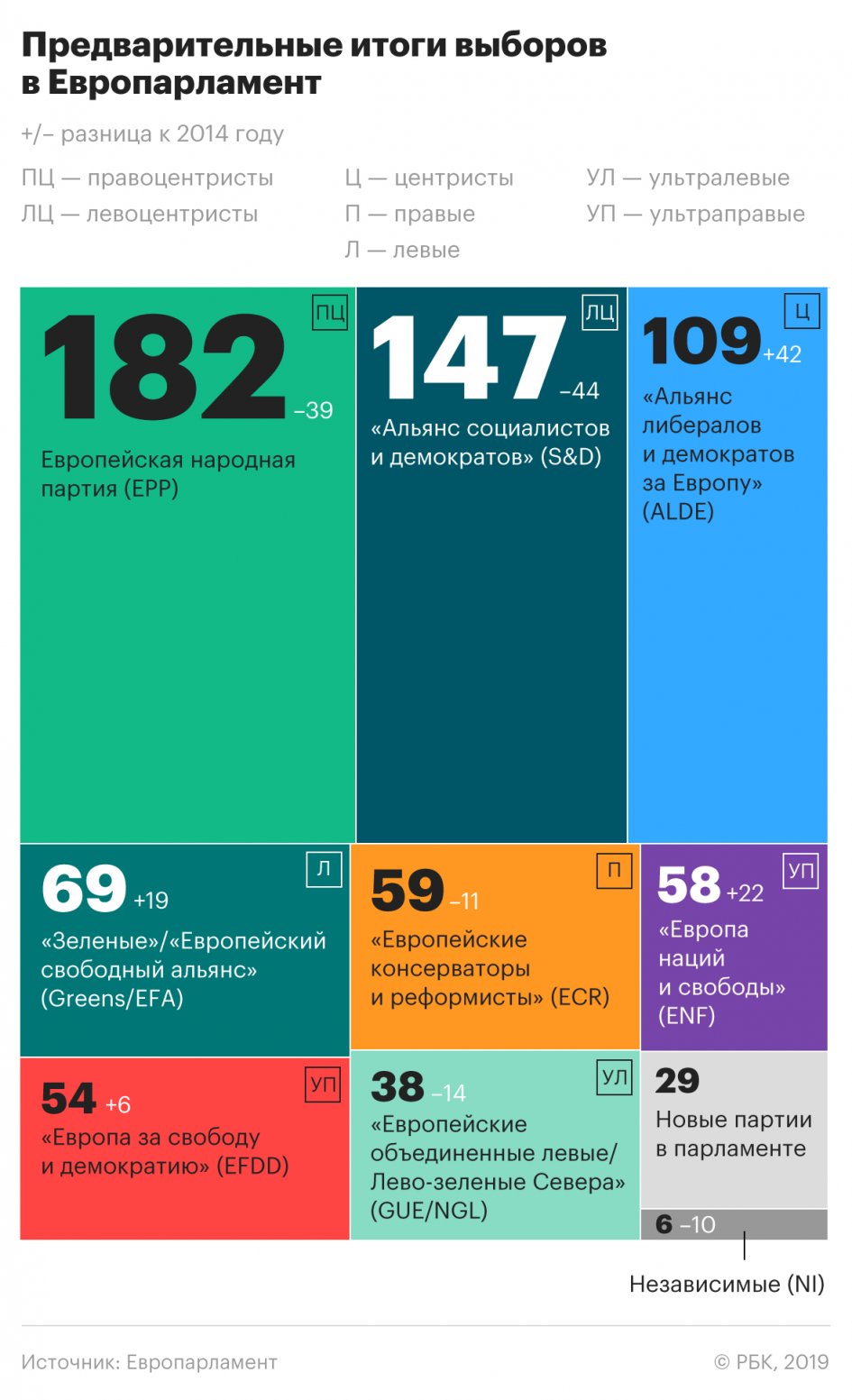 По итогам выборов впервые с 1979 года совокупного большинства в парламенте лишились две традиционные партии — Европейская народная партия и «Альянс социалистов и демократов». По предварительным данным, они получат 329 депутатских мандатов. Пять лет назад они завоевали 412 мест. Это означает, что в будущем при распределении постов в Еврокомиссии и в законотворческой работе им придется вести переговоры с другими партиями, прежде всего с либералами.