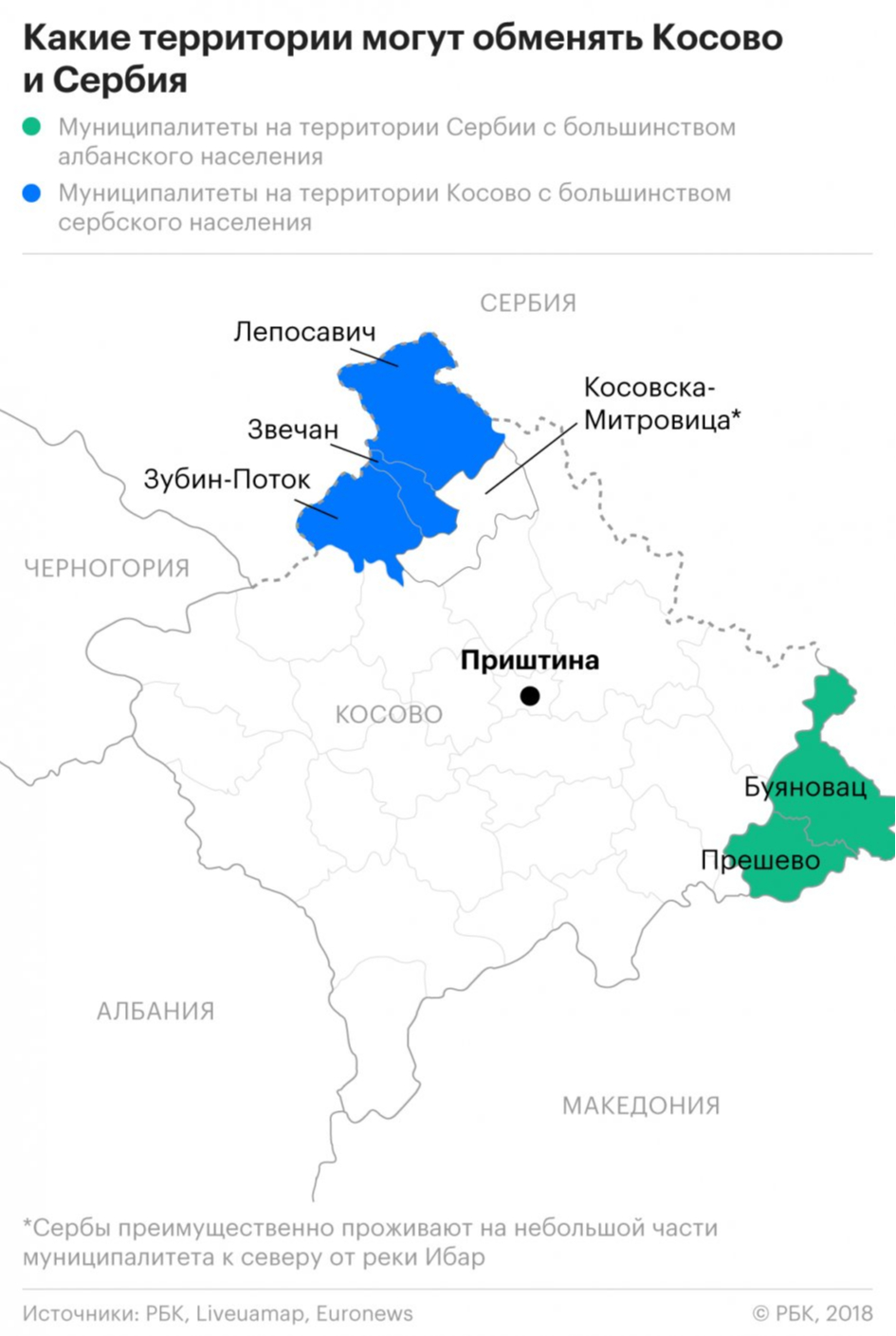 Взамен Косово может получить два муниципалитета в Сербии, где значительную долю населения составляют албанцы, — это Прешево и Буяновац. Во вторник, 28 августа, Тачи в беседе с Reuters отметил, что пересмотр границ таким образом, чтобы регионы Сербии с большинством албанского населения оказались в Косово, помог бы снять напряжение.