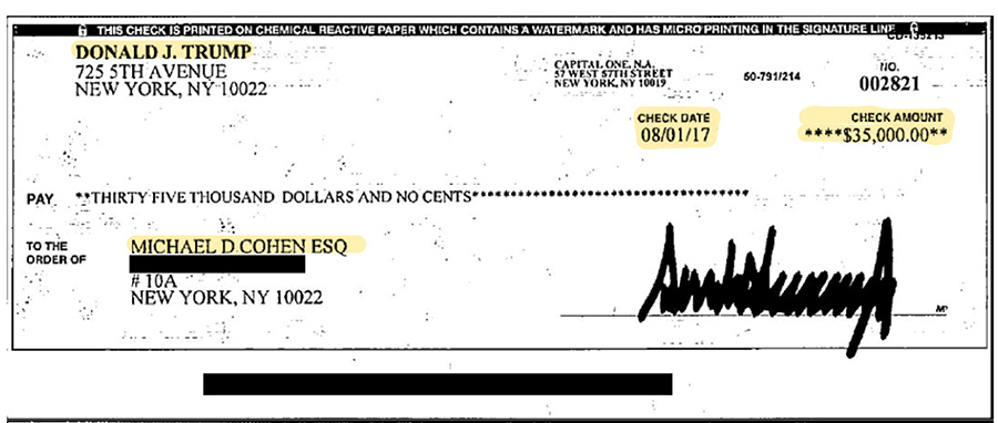 Кроме того, Коэн предъявил чек на $35 тыс., подписанный Трампом. Этот чек, по его словам, был выписан президентом, чтобы возместить ему «незаконный платеж за молчание», когда адвокат заплатил из своих собственных средств за молчание порноактрисе Стэффани Клиффорд, выступающей под псевдонимом Сторми Дэниелс.