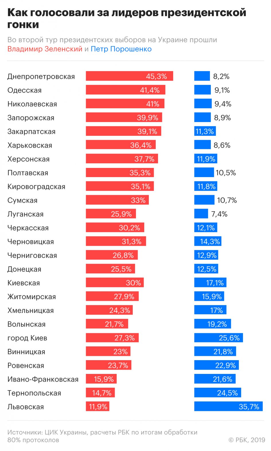 Явка на выборах составила 63,52%, что несколько выше итоговой явки пять лет назад (59,48%). Зеленский получил относительное большинство в 20 из 25 областей Украины. За действующим президентом только две области — Львовская и Тернопольская. Тимошенко удалось стать лидером в одной — Ивано-Франковской. В Луганской и Донецкой областях (на контролируемых Украиной территориях) первое место занял Юрий Бойко, поддержанный «Оппозиционной платформой — За жизнь».