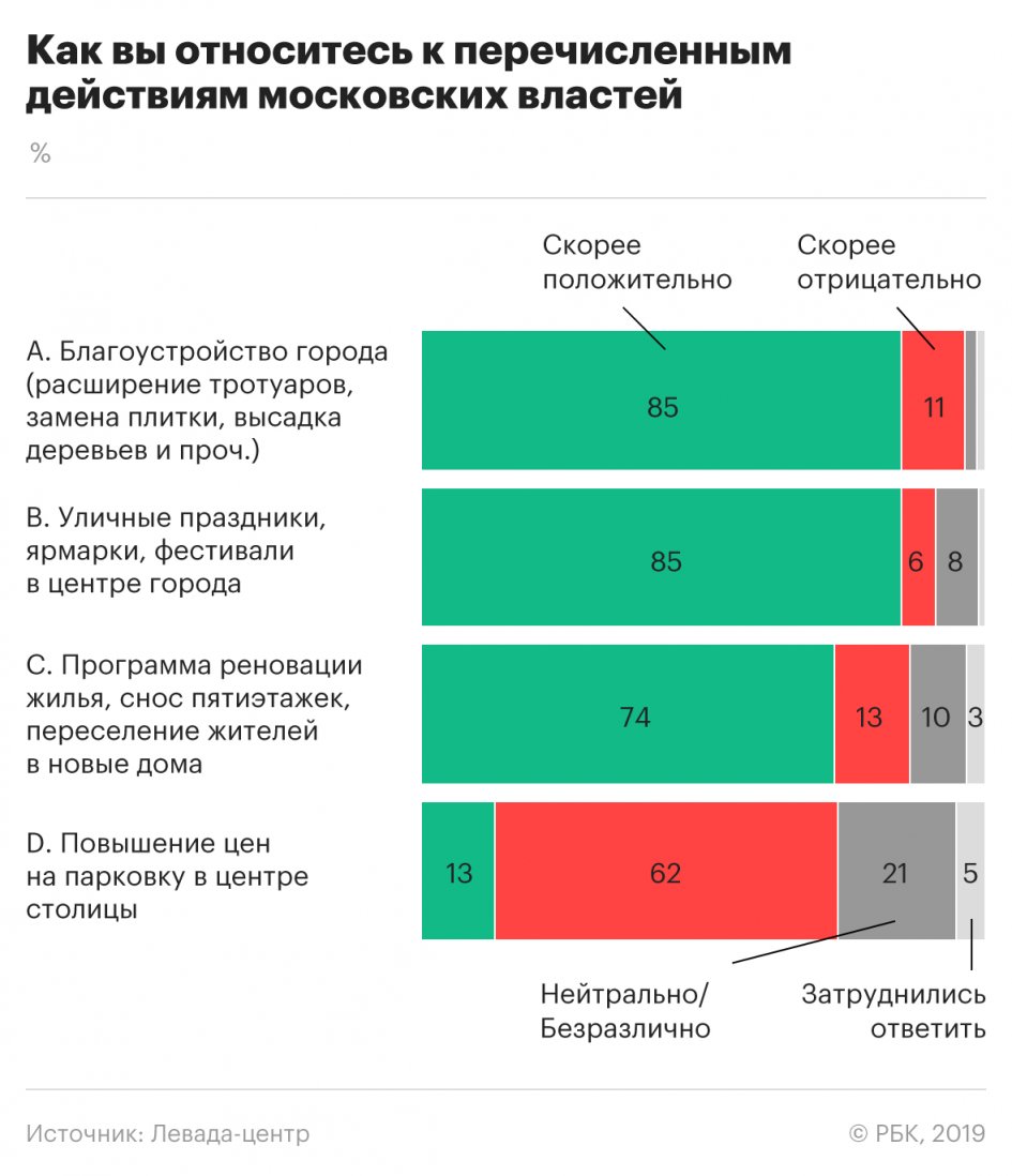 Другой вопрос социологов касался отношения к инициативам городской администрации. Москвичи скорее положительно относятся к работам по благоустройству города (85%), уличным фестивалям и праздникам (также 85%) и программе реновации жилья (74%). Скорее отрицательно (62%) респонденты оценивают повышение тарифов на парковку в центре столицы. Всего 13% эту меру одобряют.