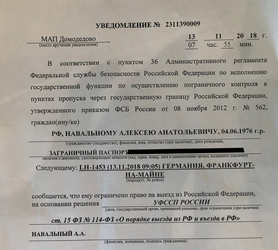 «Есть некое письмо, что выезжать запрещено, но объяснений почему нет», — отметил Навальный.