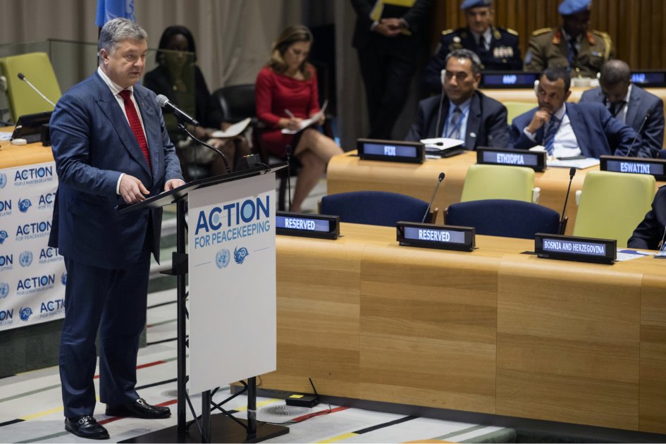 Практически полностью России посвятил свою речь президент Украины Петр Порошенко. «Москва превращает украинцев в сирот, — заявил он. — Они мучают наших патриотов в тюрьмах». Он также много говорил о необходимости развертывания миротворческой миссии ООН в зоне конфликта в Донбассе. «Украина разделяет подход генерального секретаря к миротворческой деятельности как к концепции действия во имя мира», — сказал Порошенко. По его словам, ООН помогла бы Украине, если бы «развернула многонациональную миротворческую миссию» с широким мандатом в Донбассе.