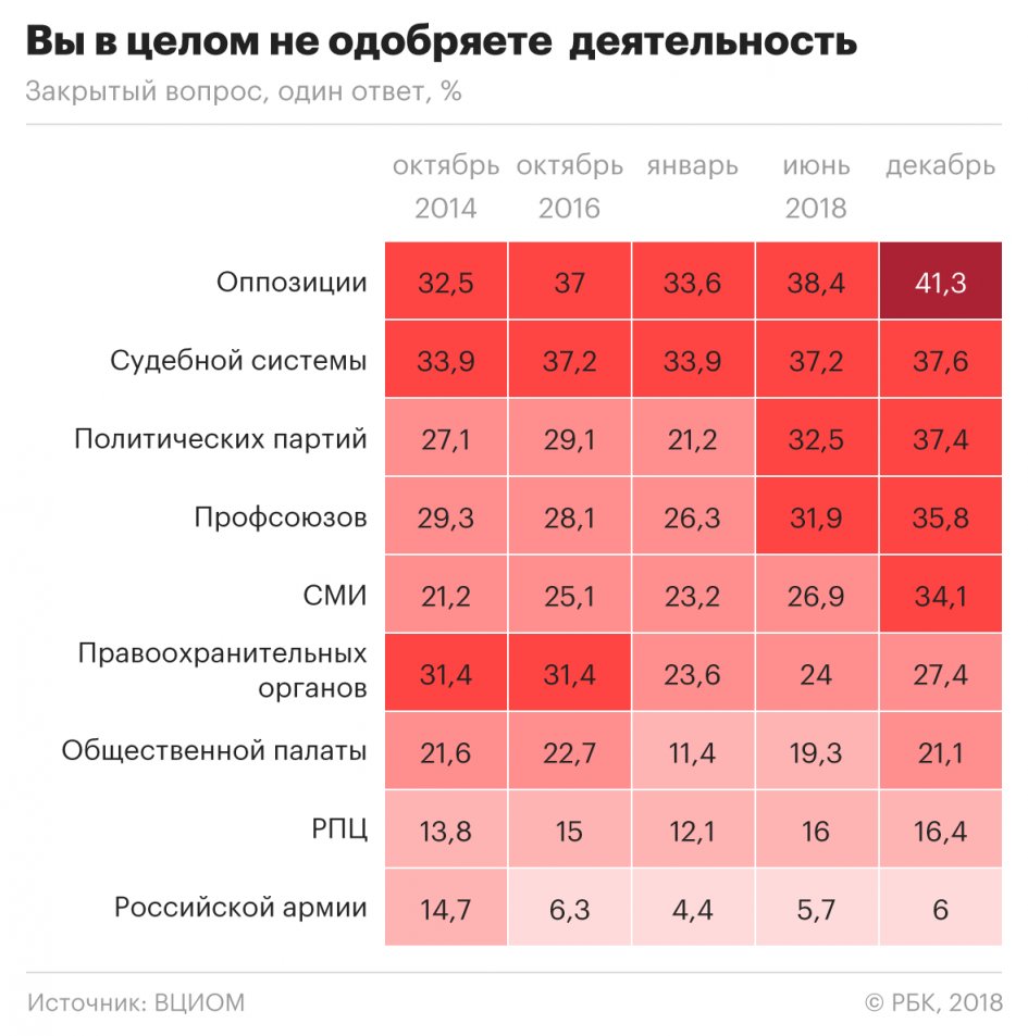 Значительное падение рейтингов институтов власти социологи фиксировали с июня, когда правительство анонсировало повышение пенсионного возраста. Если в мае, согласно ВЦИОМу, рейтинг одобрения Думы составлял 47,2%, то уже в июне он упал до 34,3% и с тех пор не превышал отметки 36%. Одобрение деятельности президента после 81,5% в середине мая в следующие месяцы не достигало 67%.