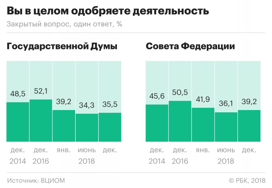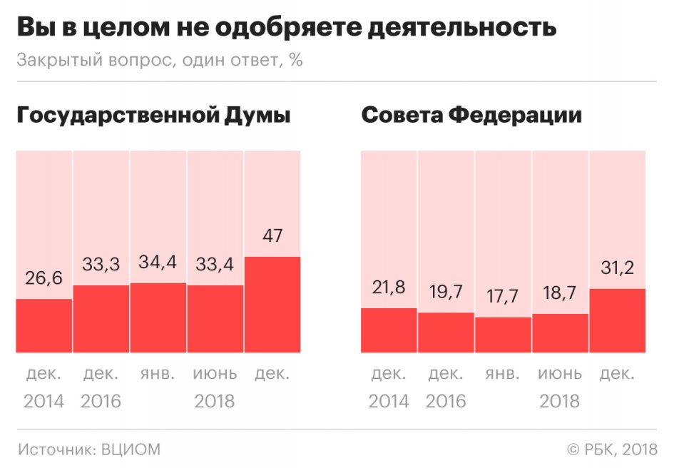 Схожие данные представлял Левада-центр. Согласно его ноябрьскому опросу, деятельность Думы не одобряют 63 против 36% респондентов, высказывающих противоположное мнение. В мае уровень одобрения Думы достигал 43%. В следующие месяцы он не превышал 38%. Одобрение президента Владимира Путина после майских 79% в следующие месяцы не превышало 70%.