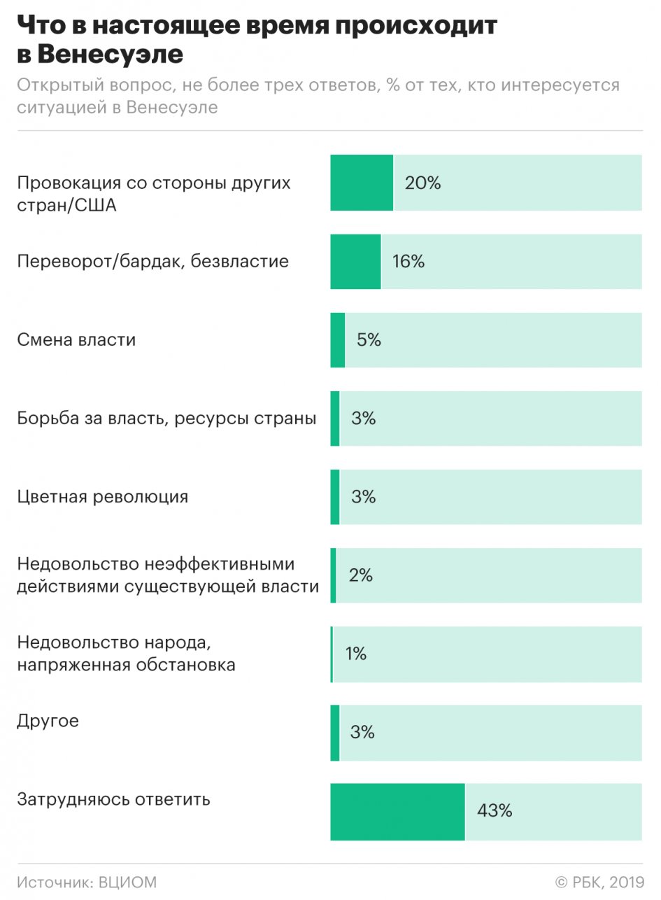 20% из тех, кто интересуется ситуацией вокруг Венесуэлы, считают происходящее в латиноамериканской стране провокацией со стороны других стран, в частности США. Еще ​16% опрошенных характеризуют ситуацию в Венесуэле как «переворот и безвластие», а 3% — как «борьбу за ресурсы». Однако почти половина респондентов (43%) затруднились назвать причину кризиса в Венесуэле.