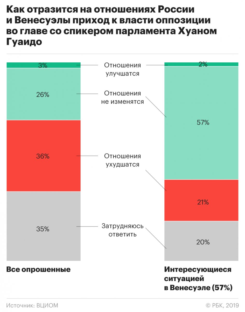 Нынешний уровень сотрудничества между Россией и Венесуэлой, в которую Москва инвестировала $​17 млрд, чуть больше половины опрошенных (51%) оценивают позитивно и не опасаются его снижения в случае прихода к власти оппозиции во главе с Гуаидо (об этом заявили 57%). Но 36% россиян считают, что отношения Москвы и Каракаса ухудшатся, если Мадуро будет вынужден уйти.​