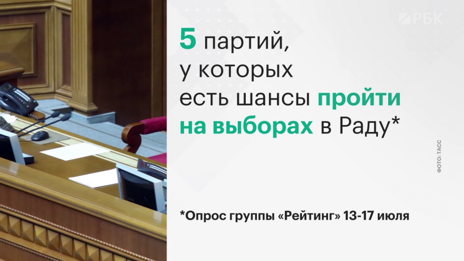 Досрочные парламентские выборы на Украине пройдут 21 июля. По данным последнего социологического опроса 49,5% избирателей готовы проголосовать за «Слугу народа». Далее в рейтинге идут «Оппозиционная платформа — За жизнь» Юрия Бойко, «Европейская солидарность» Петра Порошенко, «Батькивщина» Юлии Тимошенко, «Голос» Святослава Вакарчука.