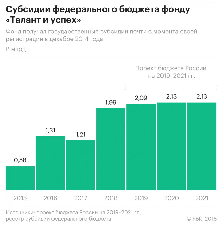 Общие субсидии федерального бюджета фонду «Талант и успех» в 2019 году планируются на уровне 2,09 млрд руб., в 2020 и 2021 годах — по 2,13 млрд руб., то есть всего 6,35 млрд руб. Это следует из проекта федерального бюджета на 2019–2021 годы, с которым ознакомился РБК.