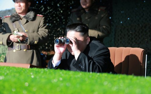 Кроме того, опубликованы фотографии северокорейского лидера Ким Чен Ына, который наблюдает за ходом учений c биноклем в руках.