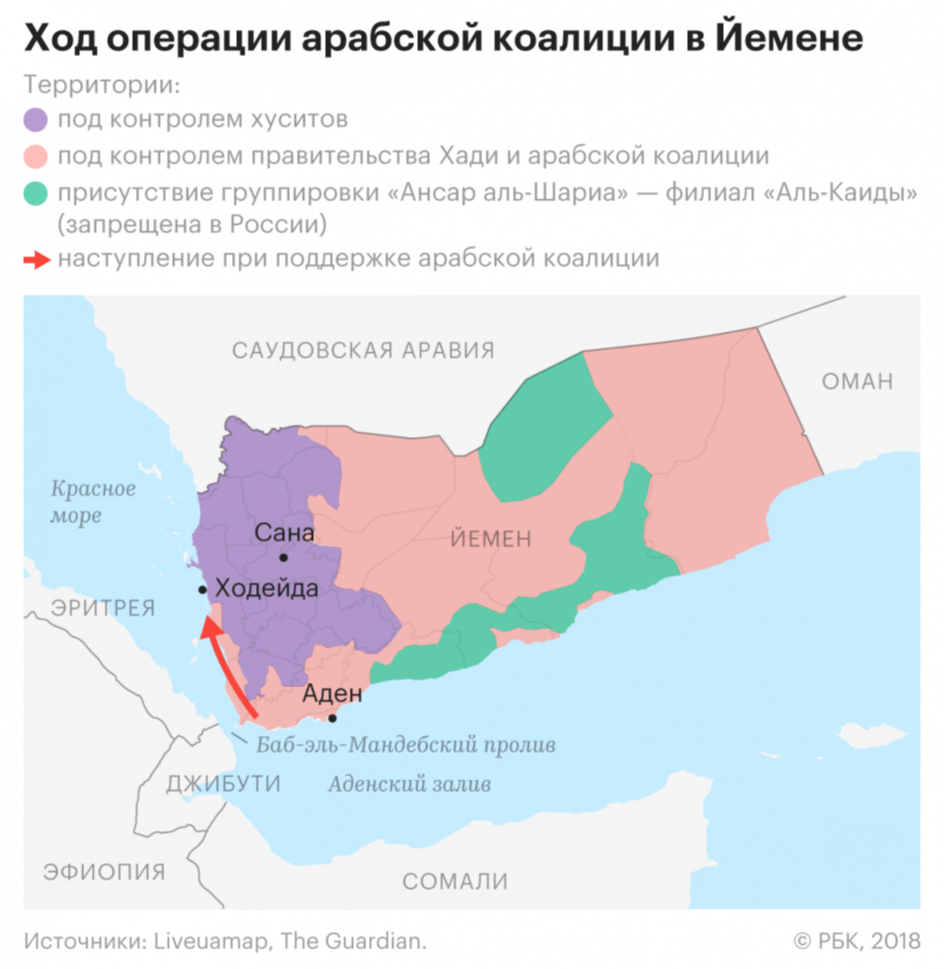 В июне этого года арабская коалиция начала крупнейшее за годы войны наступление на йеменский порт Ходейда, который находится под контролем хуситов. Операция получила название «Золотая победа», она продолжается до сих пор.