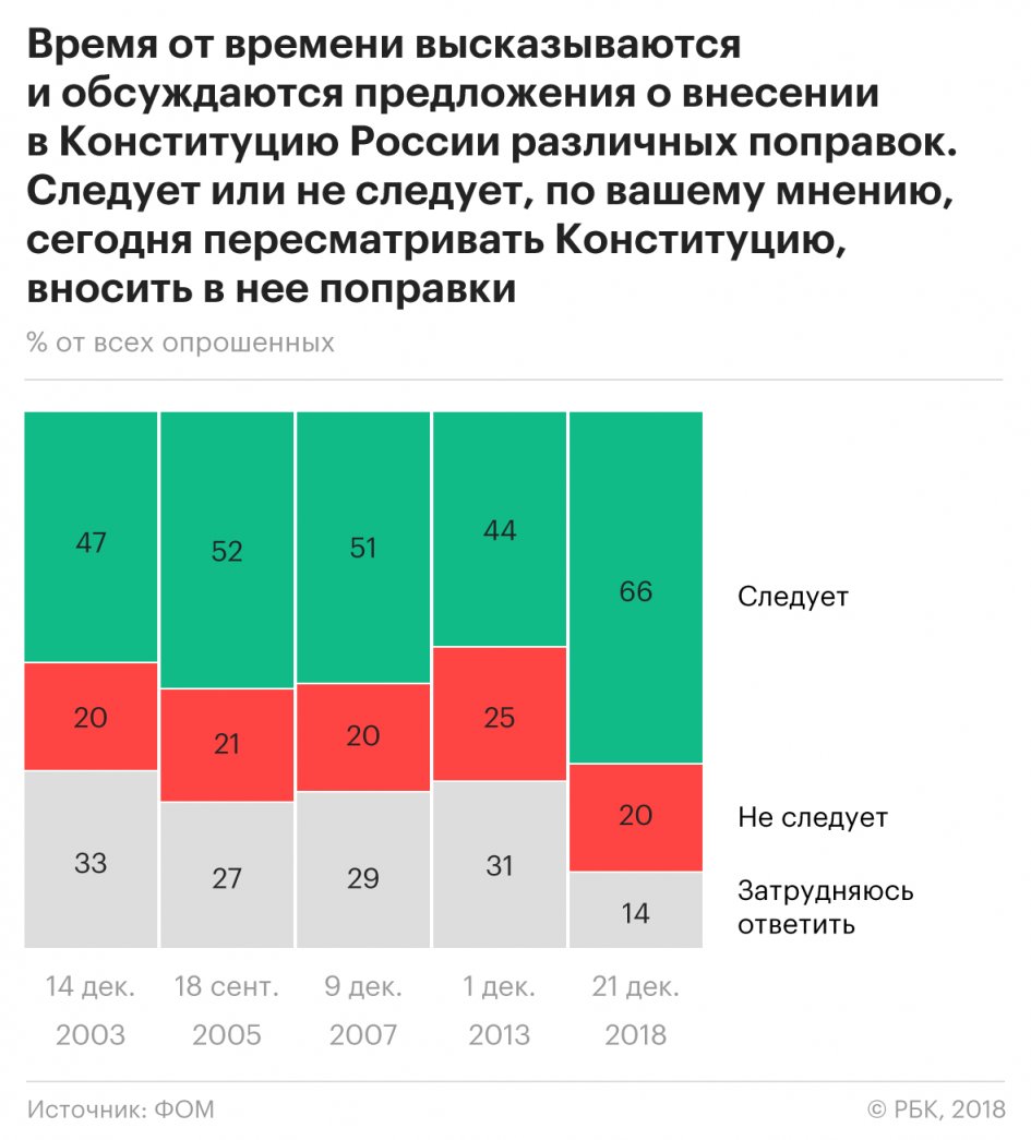 ФОМ фиксирует рекордный запрос на реформу Конституции: 66% респондентов считают, что основной документ надо пересмотреть и внести в него поправки (пять лет назад так считали только 44%).