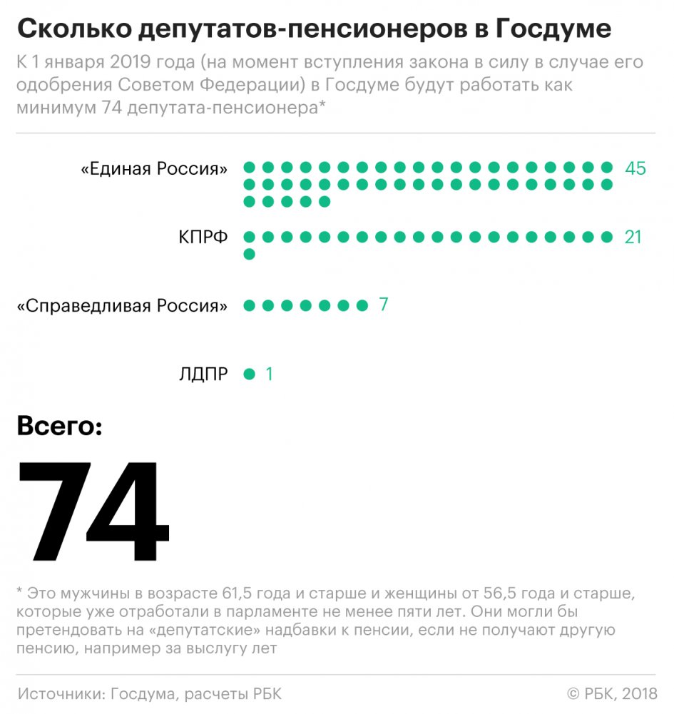 К 1 января 2019 года в Госдуме будут работать как минимум 133 депутата-пенсионера — это мужчины в возрасте 61,5 года и старше и женщины от 56,5 года и старше. Однако только 74 депутата работали в других составах Госдумы, а значит, имеют право на ежемесячную доплату к пенсии по старости.