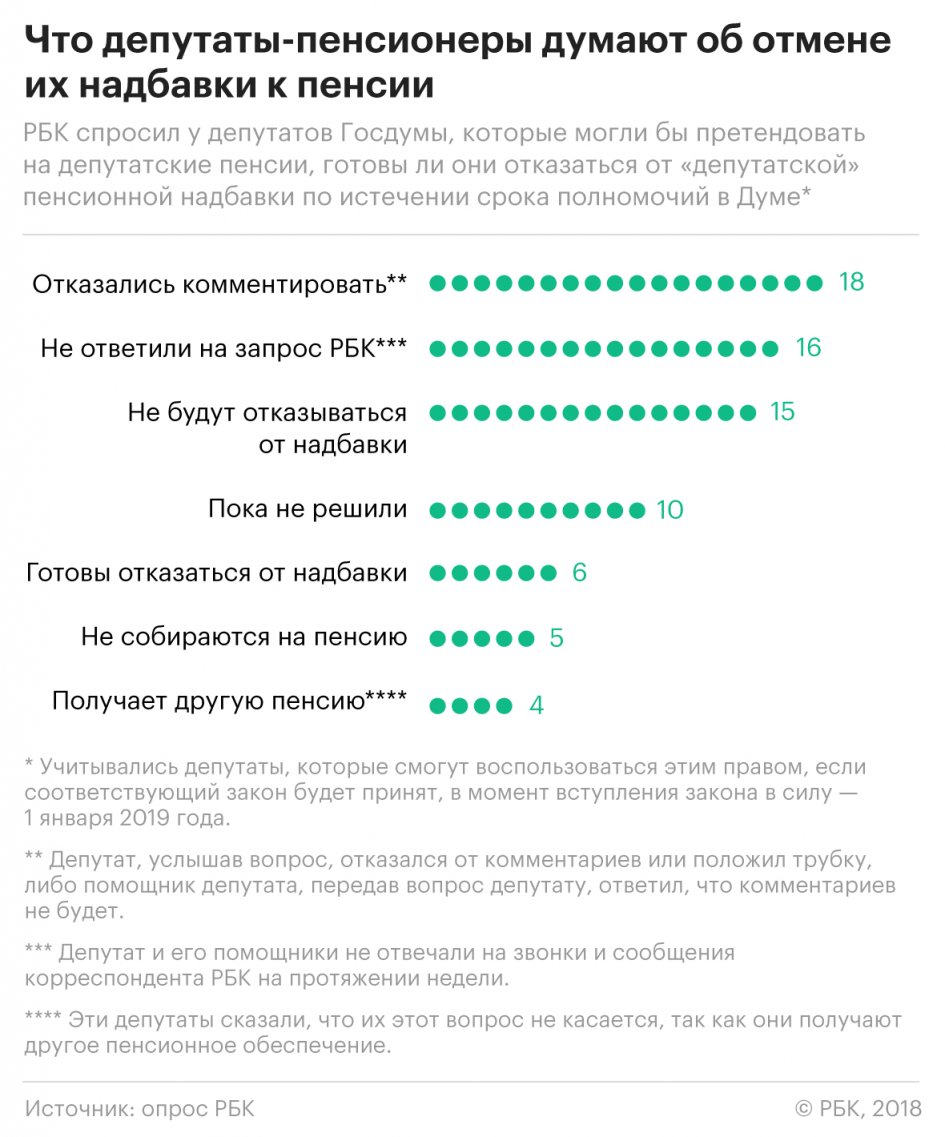 Еще четверо из 74 опрошенных депутатов-пенсионеров отметили, что норма о пенсионной надбавке на них не распространяется, так как они получают другое пенсионное обеспечение.