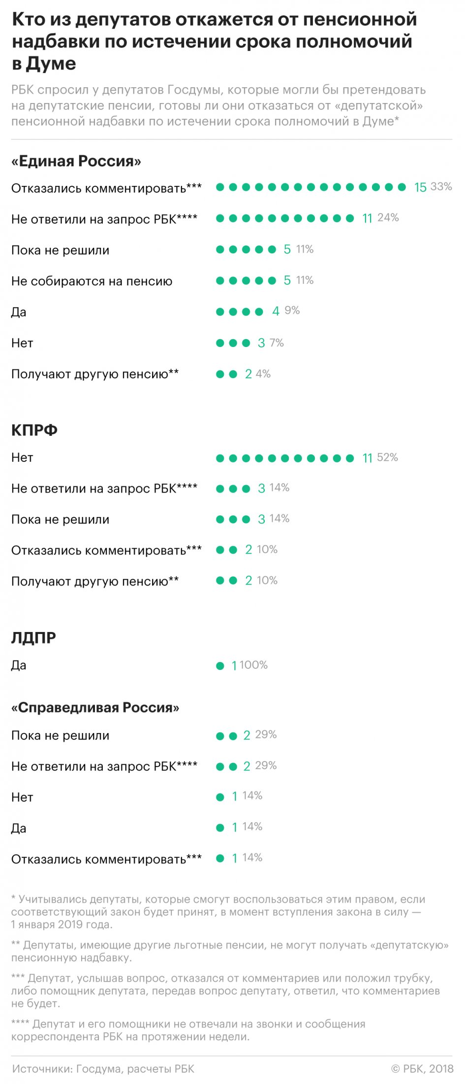 Почти половина опрошенных — 33 человека — уклонились от ответа. Эти депутаты либо отказались от комментариев, либо ответили, что пока не решили, либо сказали, что не собираются выходить на пенсию из парламента.