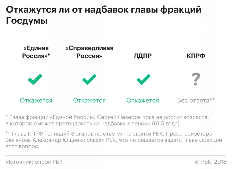 На вопрос РБК об отказе от депутатской надбавки положительно ответили также руководитель фракции «Справедливая Россия» Сергей Миронов и глава фракции ЛДПР Владимир Жириновский. Глава либерал-демократов, который является единственным депутатом пенсионного возраста в своей фракции, заявил, что все депутаты от ЛДПР напишут заявления на отказ от надбавок. «Многим депутатам и 40 лет нет, есть и моложе 30. Так что до пенсии большинству из них еще долго», — добавил он.