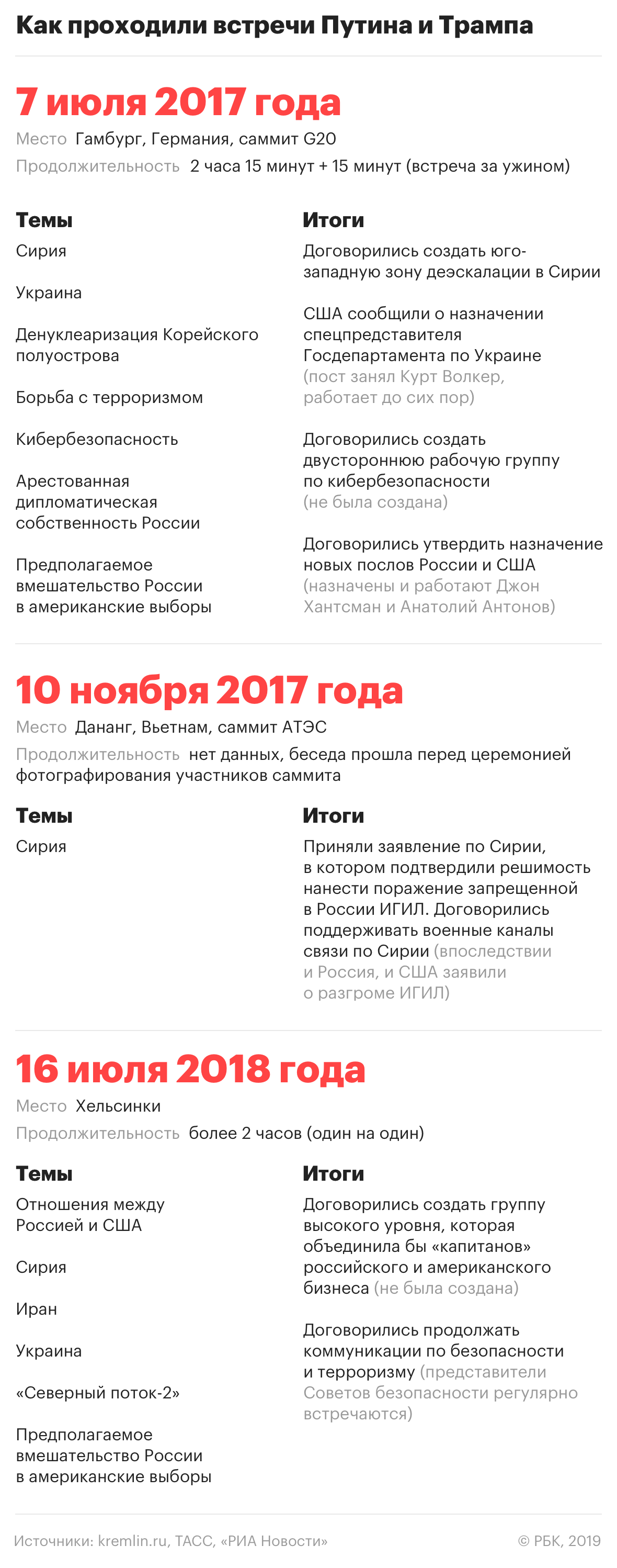 Встреча Путина и Трампа прошла в пятницу, 28 июня, на полях саммита. Президенты общались на протяжении почти полутора часов. В переговорах участвовали помощник российского лидера Юрий Ушаков, пресс-секретарь президента Дмитрий Песков, глава МИДа Сергей Лавров и первый вице-премьер — министр финансов Антон Силуанов. Американскую делегацию составили госсекретарь Майкл Помпео, помощник президента по нацбезопасности Джон Болтон, глава Минфина Стив Мнучин, а также дочь и зять президента Иванка Трамп и Джаред Кушнер.