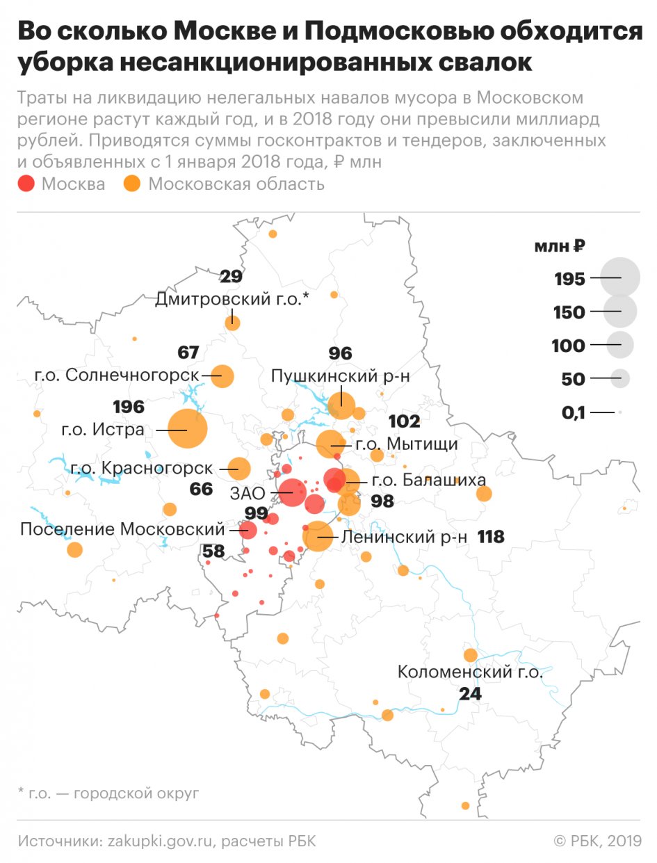 На втором месте — городской округ Мытищи, где на вывоз нелегальных свалок ушло более 102 млн руб. На третьем — Балашиха. Рядом с Мытищами находится полигон ТБО «Коргашино», который власти обещали закрыть в 2018 году. Рядом с Балашихой — закрытая в 2017 году свалка «Кучино».