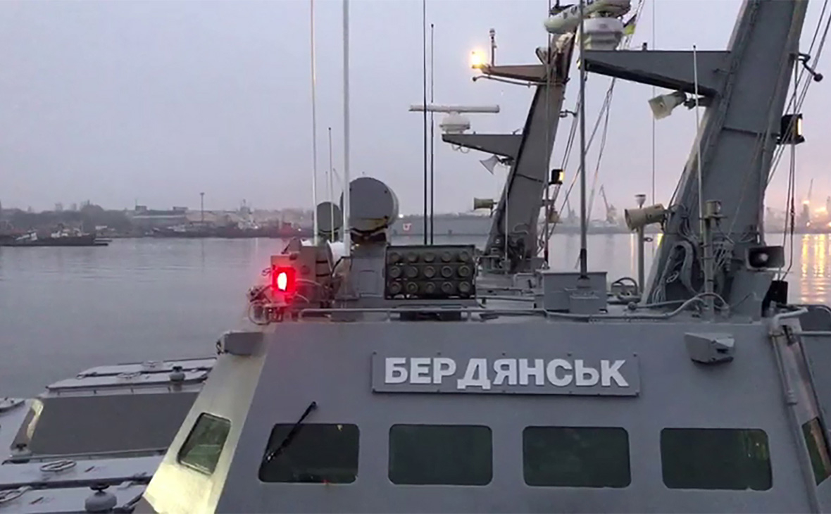 В 22:23 мск в связи с приближением кораблей ВМС Украины российская сторона приняла решение закрыть подход к Керченскому проливу со стороны Черного моря. В 3:45 мск к украинским кораблям, которые уже находились в шести-семи милях от территориальных вод Крыма, подошли еще два украинских бронекатера «Никополь» и «Бердянск». В 5:50 мск командир последнего, как указывается в сообщении ЦОС ФСБ, довел до российской стороны информацию, что «в соответствии с положениями договора между Россией и Украиной «О сотрудничестве в использовании Азовского моря и Керченского пролива от 24 декабря 2003 года» судна имеют право на свободу судоходства».