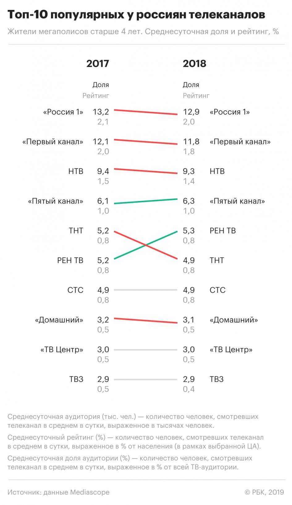 У трех крупнейших вещателей по итогам 2018 года среднесуточные доли в самой общей аудитории (все зрители старше четырех лет) снизились, следует из данных исследовательской компании Mediascope. У «России 1» и «Первого канала» — на 0,3 п.п., у НТВ — на 0,1 п.п.