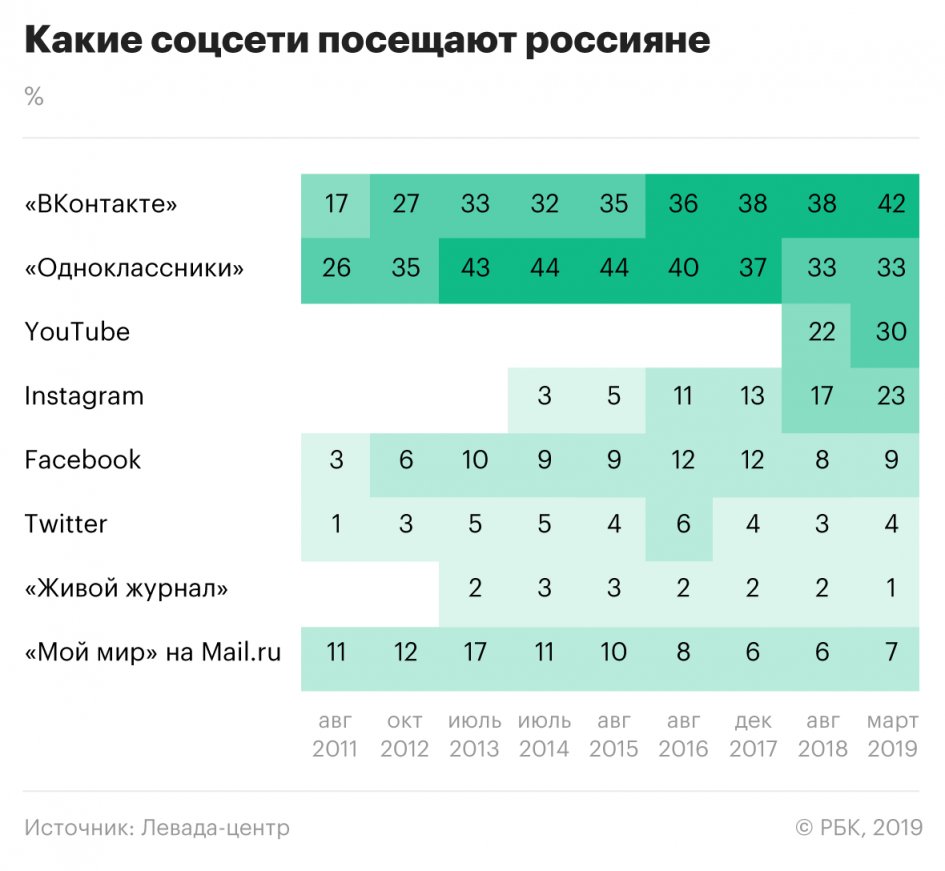 Наиболее популярными социальными сетями в России являются «ВКонтакте» (пользуется порядка 42% россиян), «Одноклассники» (33%), YouTube (30%) и Instagram (23%). Аудитория Facebook в России насчитывает порядка 9%, Twitter — 4%. Аудитория «ВКонтакте», Instagram, Twitter моложе, нежели аудитория «Одноклассников». Социологи указывают на почти непрерывный рост числа посетителей социальных сетей на протяжении последних восьми лет.
