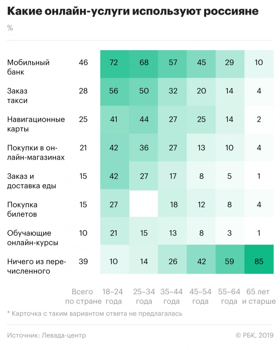 По данным Левада-центра, среди интернет-услуг россияне чаще всего используют мобильный банкинг (46% используют «время от времени»), заказ такси (28%), карты и навигаторы (25%). Еще 21% совершает покупки в онлайн-магазинах (21%), а 15% россиян заказывают еду и приобретают билеты. Около 10% опрошенных проходили учебные онлайн-курсы.