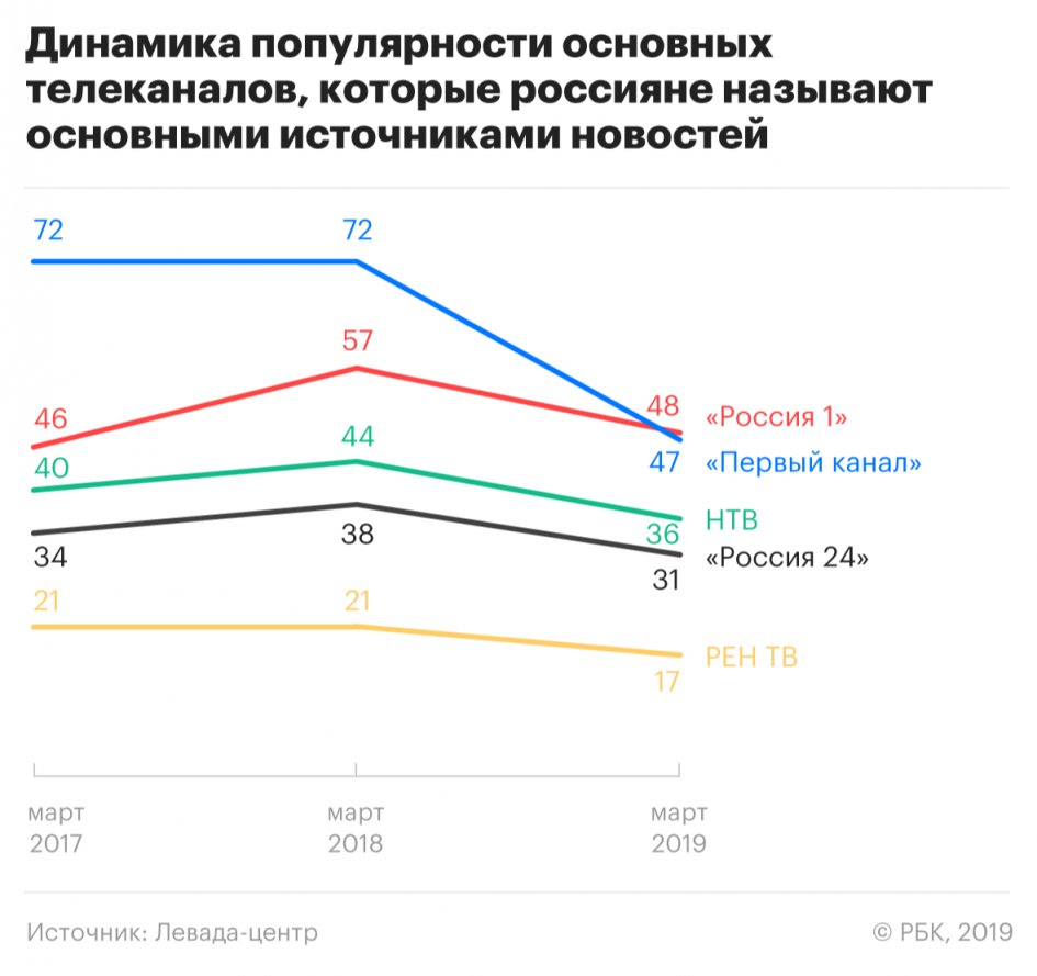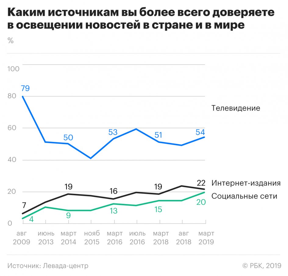 Доверие к телевидению как источнику новостей в последние годы колеблется вокруг 55% респондентов, хотя десять лет назад около 80% респондентов доверяли ТВ. Доверие к телевидению сохраняют в первую очередь россияне старше 35 лет.