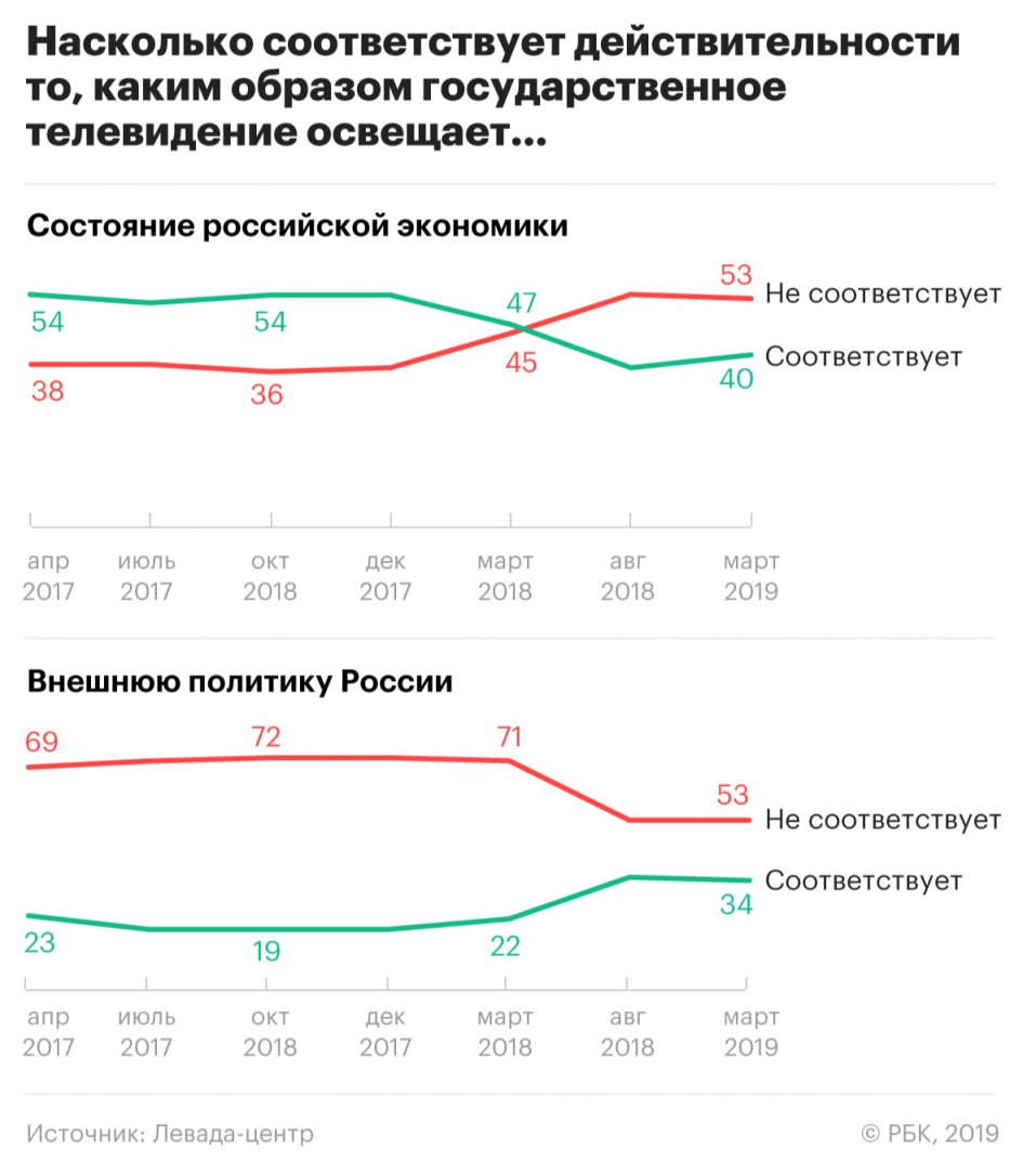 Телевидение зачастую представляется респондентами зависимым от государства каналом информации, уровень доверия к нему связан с одобрением деятельности руководства страны и положением дел в стране, считают социологи. На сегодня более половины населения считает, что освещение телеканалами положения дел в экономике «не соответствует действительности». За год недоверие россиян к тому, как гостелевидение освещает российскую экономику, выросло с 45 до 52% (доверяют теперь только 40%). За тот же период недоверие к освещению внешней политики также выросло — с 22 до 34% (обратного мнения придерживаются 53%).