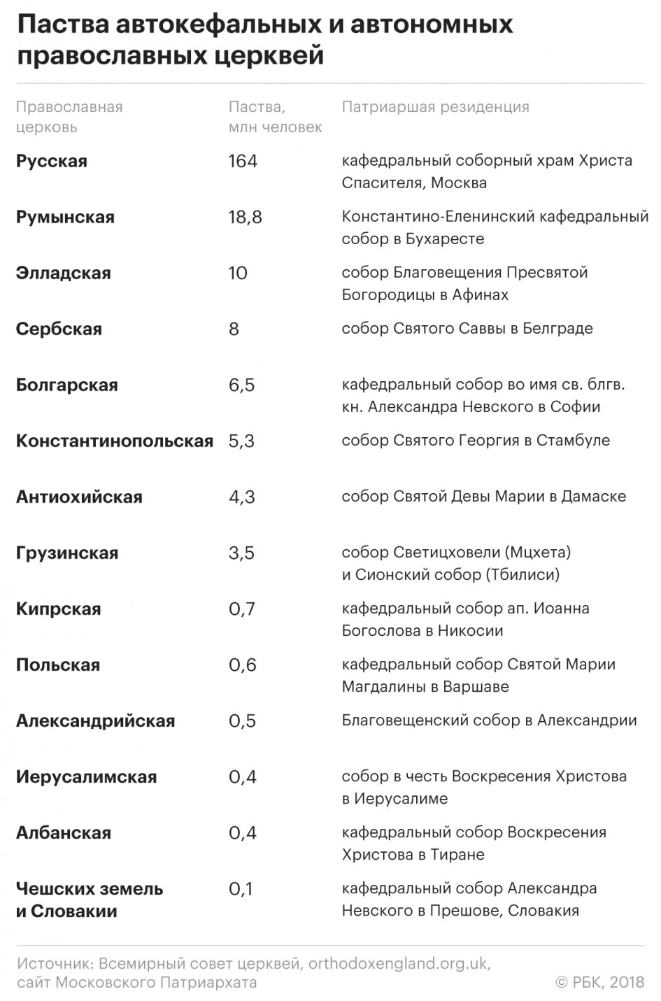 В диптихе РПЦ — 15 поместных (автокефальных) православных церквей, в диптихе Константинополя — 14 (РПЦ признает еще и Американскую православную церковь). Вселенский патриарх в диптихе (старшинстве чести) считается первым среди равных. При этом по пастве лидирует Русская православная церковь — 164 млн человек (данные Всемирного совета церквей). На втором месте — Румынская православная церковь с паствой 18,8 млн человек, у Константинопольского патриархата — 5,3 млн. У поместных церквей существуют и экзархаты. Для РПЦ это, например, Украинская православная церковь, Белорусская православная церковь.