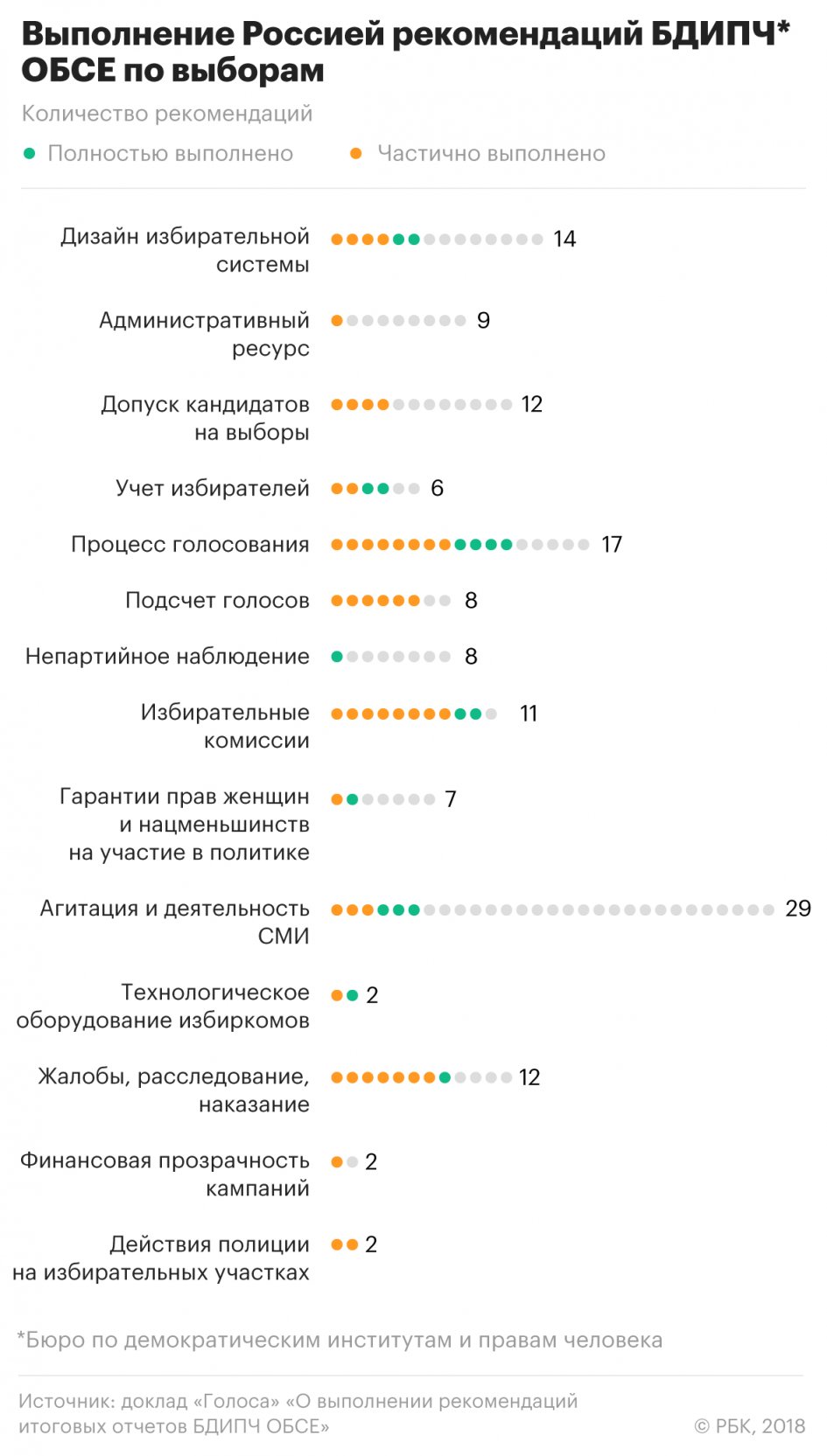 Из 139 рекомендаций эксперты признали полностью выполненными 17 (12,2%), частично выполненными — 48 (34,5%), невыполненными — 74 (53,2%). Некоторые предложения настойчиво повторяются во всех отчетах ОБСЕ, отмечается в аналитическом докладе «Голоса» (копия имеется в редакции РБК). Все рекомендации в соответствии со своей тематикой эксперты разделили на 14 групп.