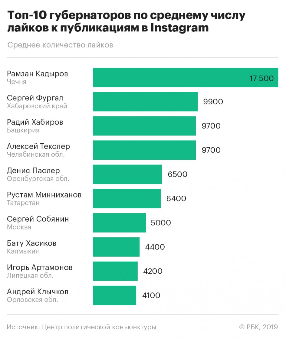 Самые популярные губернаторы по среднему числу лайков к постам в Instagram: глава Чечни Рамзан Кадыров (17,5 тыс.), губернатор Хабаровского края Сергей Фургал (9,9 тыс.), лидер Башкирии Радий Хабиров (9,7 тыс.), губернатор Челябинской области Алексей Текслер (9,7 тыс.), глава Оренбуржья Денис Паслер (6,5 тыс.) (полный список).