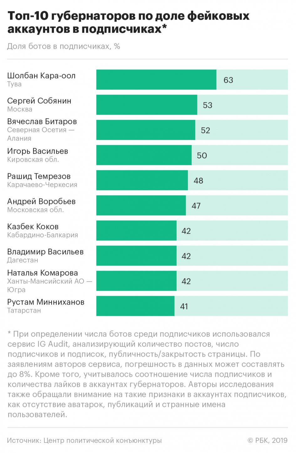 Эксперты ЦПК подсчитали долю ботов среди подписчиков губернаторов при помощи сервиса IG Audit, который анализирует количество постов, число подписчиков и подписок и по набору этих критериев вычленяет реальных подписчиков. Погрешность инструмента составляет около 8% (погрешность связана с тем, что каждый раз IG Audit формирует случайную выборку подписчиков и анализирует ее).