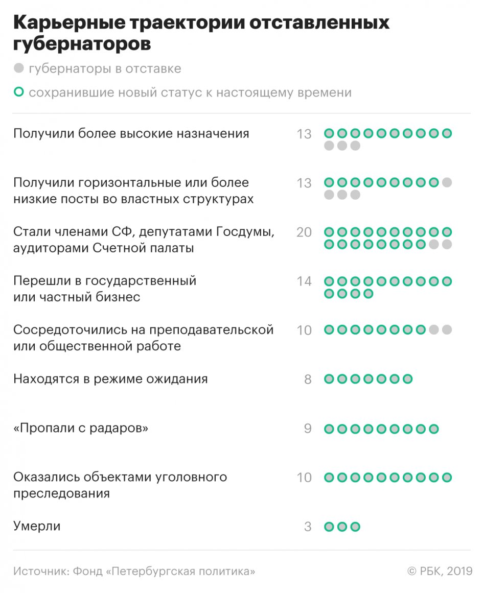 Процесс замены губернаторов в прошедшие годы был продиктован необходимостью обновления кадров, формирования нового типа регионального управленца: теперь это молодой чиновник с современным образованием и опытом работы вместо аксакалов-хозяйственников, отметил политолог Миронов. В результате этого процесса Кремль заменил многих, и немногие из замененных получили статусные должности, говорит он. «Политическое время этих людей закончилось. Следовательно, их пристраивали — кого в парламент, кого в аудиторы — на маловлиятельные должности, где, однако, они могли чувствовать себя востребованными, — рассуждает эксперт. — Часто это было частью торга — отступных. Кто ушел с конфликтом или имел явно негативную репутацию, не получили ничего. В случае откровенно криминального бэкграунда следовали посадки».