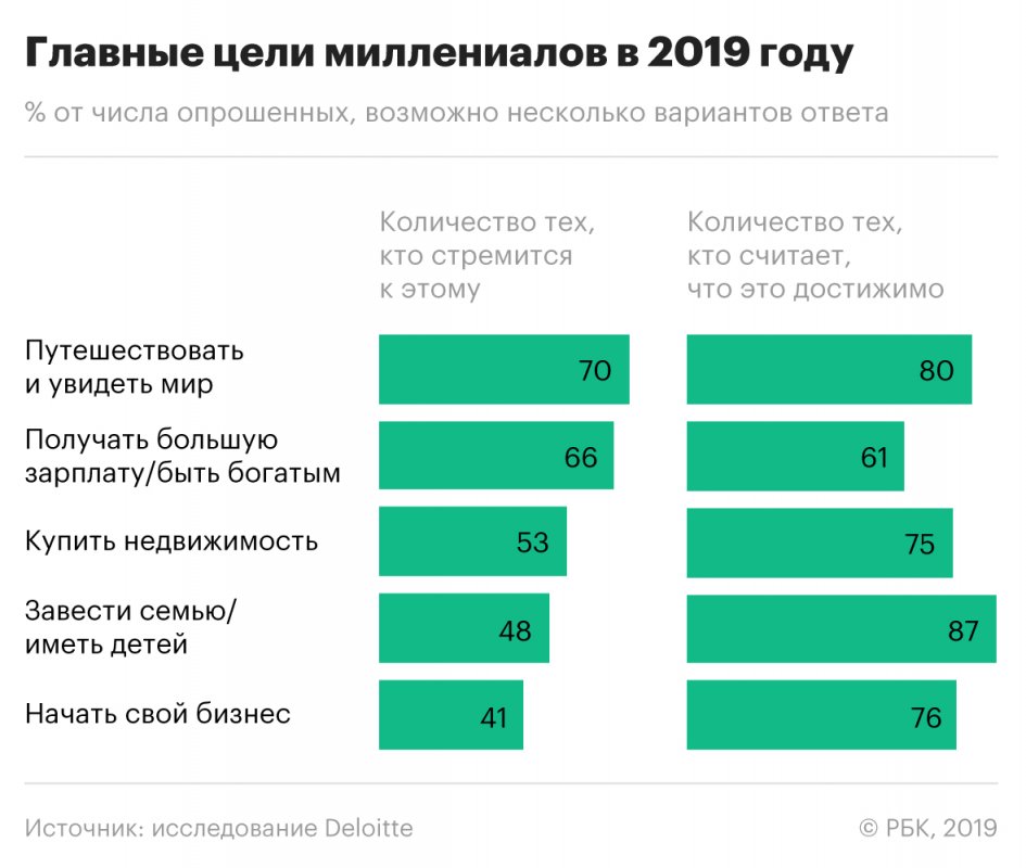 Есть различия и в жизненных целях. В России представители нового поколения активнее говорят об амбициях. Три четверти опрошенных россиян хотят путешествовать (57% среди респондентов по миру), 66% мечтают о высокой зарплате (52%), 53% хотели бы купить недвижимость (49%), 48% надеются создать семью и завести детей (39% в мире). Еще одна глобальная цель россиян не совпадает с намерениями миллениалов в целом. В России 41% респондентов хочет начать собственный бизнес. В списке амбиций миллениалов по всему миру на пятом месте — желание изменить общество в лучшую сторону (46%).