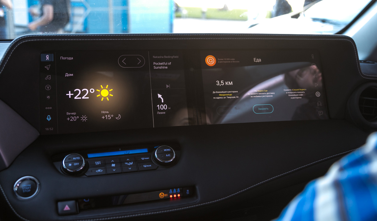 Разработчики Яндекс.Авто показали на YaC два демонстрационных автомобиля: один на базе электрокара Nissan Leaf, а второй — на базе кроссовера Toyota RAV4. Особенность машин — приборная панель с двумя экранами, для водителя и для пассажира. На первом экране собраны сервисы, которые помогают в пути, а второй предназначен для развлечений. Системой можно управлять голосом — за это отвечает голосовой помощник Алиса. В серийных автомобилях таких систем пока нет — это прототипы, созданные в сотрудничестве с автопроизводителями.