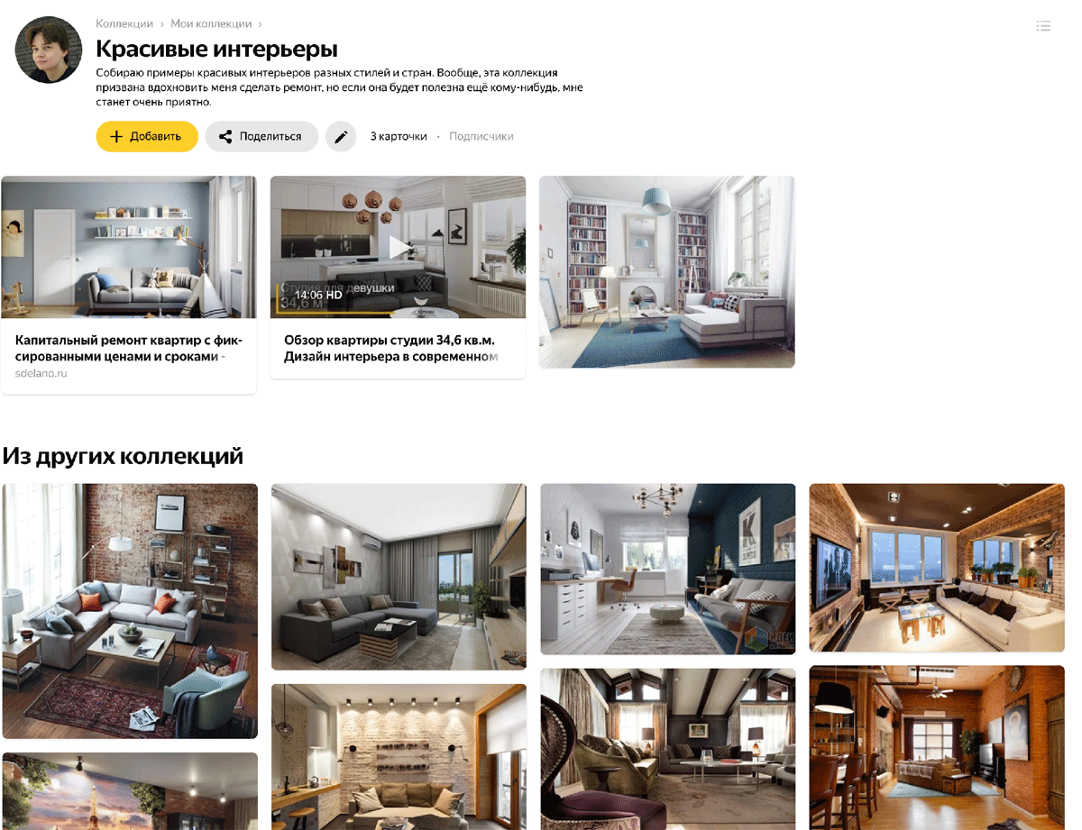 Личную коллекцию можно сделать приватной — в этом случае она будет доступна только вам — или публичной: тогда на неё смогут подписаться другие пользователи. Лучшие публичные коллекции Яндекс показывает в результатах поиска.