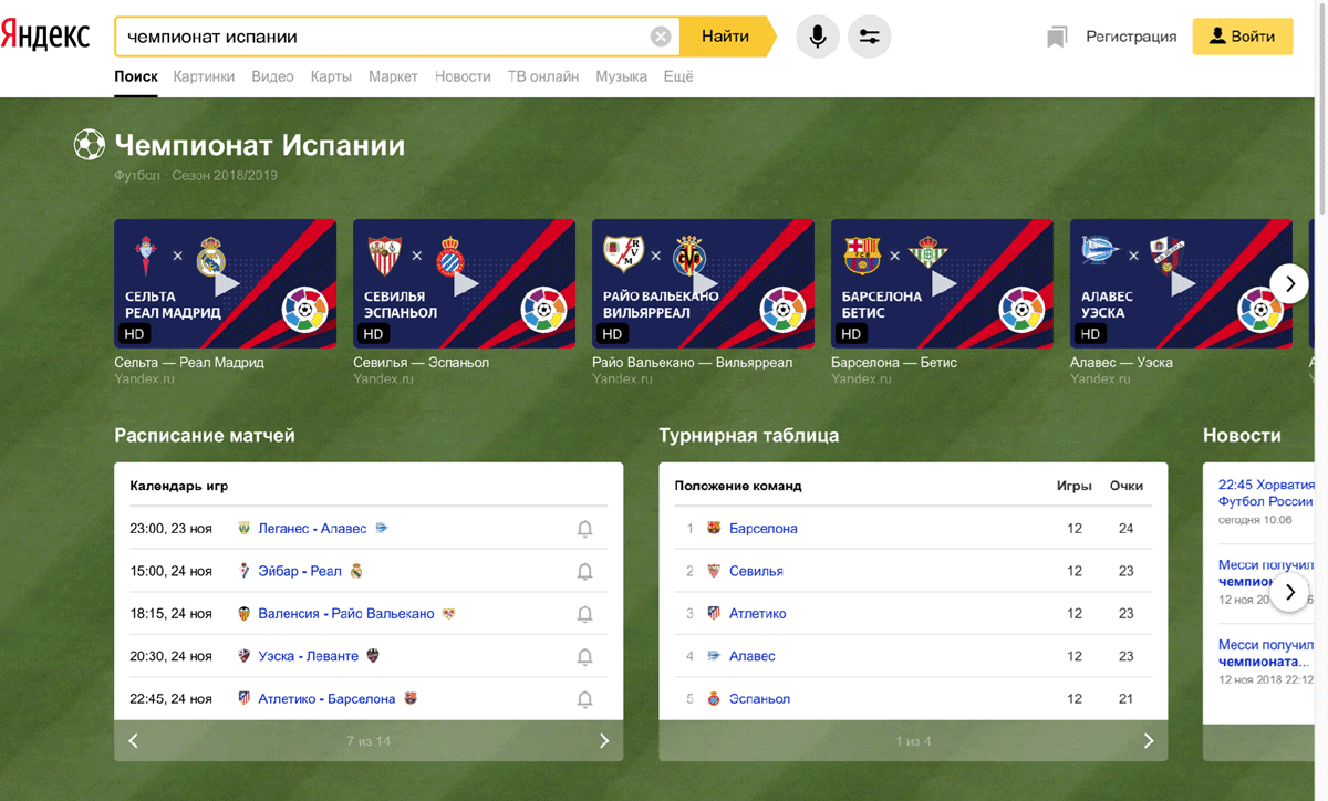 Следить за спортивными событиями тоже можно прямо на поиске. Например, в ответ на запрос [чемпионат испании по футболу] Яндекс покажет турнирную таблицу, новости, записи уже сыгранных матчей и календарь предстоящих игр Ла Лиги. Если вы боитесь пропустить важную игру, поставьте напоминание, и за несколько минут до начала трансляции вам придёт уведомление.