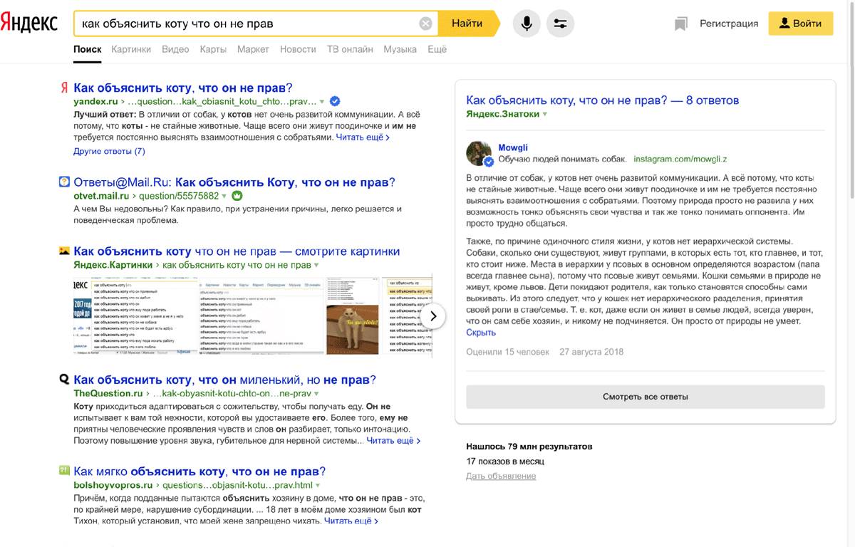 Бывают ситуации, когда короткого ответа недостаточно, — нужно объяснение. Само собой, хочется, чтобы объяснили понятно, по-человечески. В этом году мы запустили сервис Яндекс.Знатоки — это сообщество специалистов в разных областях, которые отвечают на вопросы пользователей. Скажем, студент МИФИ объяснит, [почему электроны не падают на ядро], а сотрудники портала «Чердак» расскажут, [как появляются звёзды]. Лучший ответ попадает в результаты поиска.