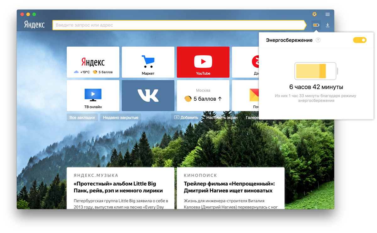 Основная программа на компьютере — браузер. В нём можно делать что угодно: читать, играть, общаться, слушать музыку, смотреть кино. Браузер постоянно открыт, поэтому от него напрямую зависит время автономной работы ноутбука. Теперь пользователи Яндекс.Браузера смогут обходиться без розетки гораздо дольше — мы добавили в Браузер режим энергосбережения.