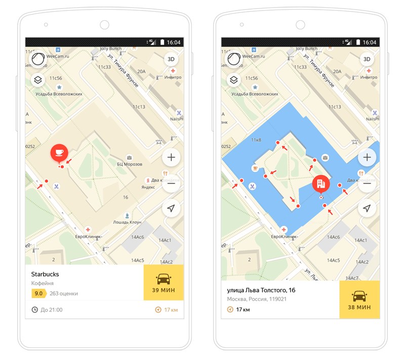 На Яндекс.Картах отмечены не только входы в коммерческие организации, но и подъезды жилых домов вместе с номерами. Эти данные учитываются при построении маршрутов. Финальная точка маршрута будет находиться с той стороны дома, где расположены подъезды. А если вы указали подъезд в адресе — например, Льва Толстого, 16, подъезд 2, — то Карты подведут вас прямо к нему.