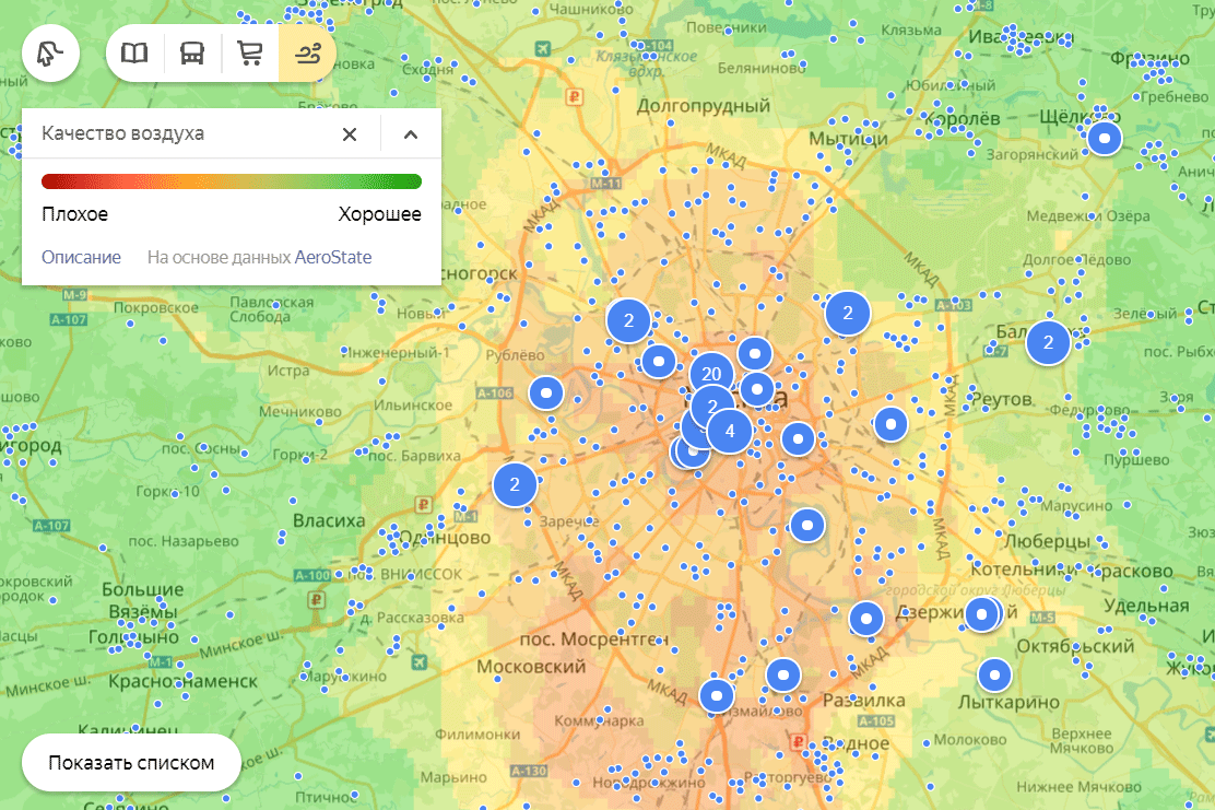 Для составления карты использовалась информация из разных источников. Данные о маршрутах, остановках и интервалах движения транспорта взяты из сервиса Яндекс.Транспорт. Сведения об инфраструктуре — из исследования по данным Яндекс.Карт. Информацию о качестве воздуха предоставила компания Aerostate.