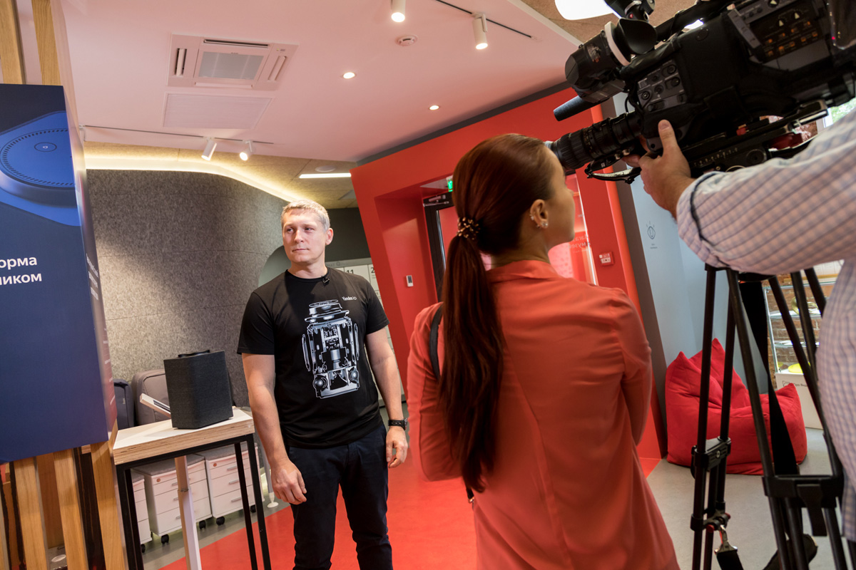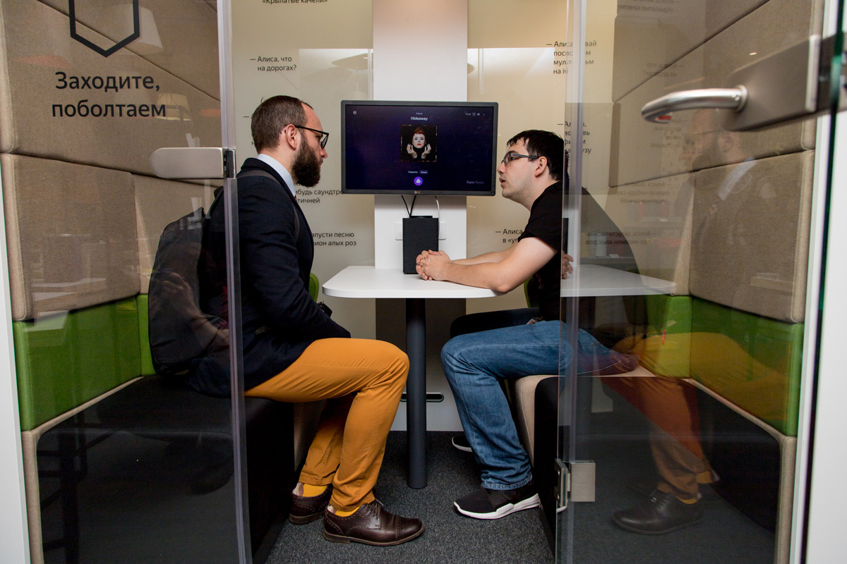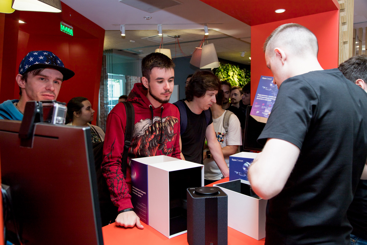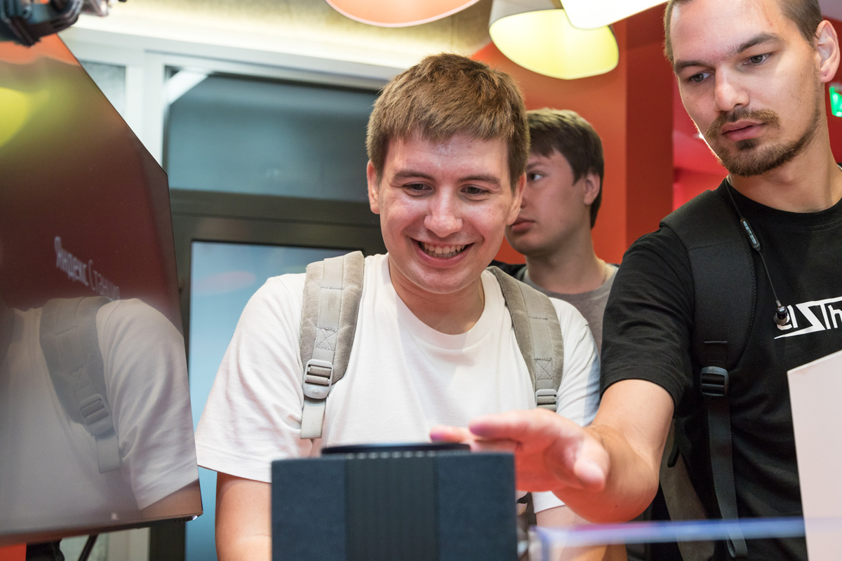В демонстрационной зоне дежурят сотрудники Яндекса, участвовавшие в создании Станции. Они рассказывают о её возможностях и отвечают на вопросы. На фото ниже — главный разработчик Станции Константин Круглов.