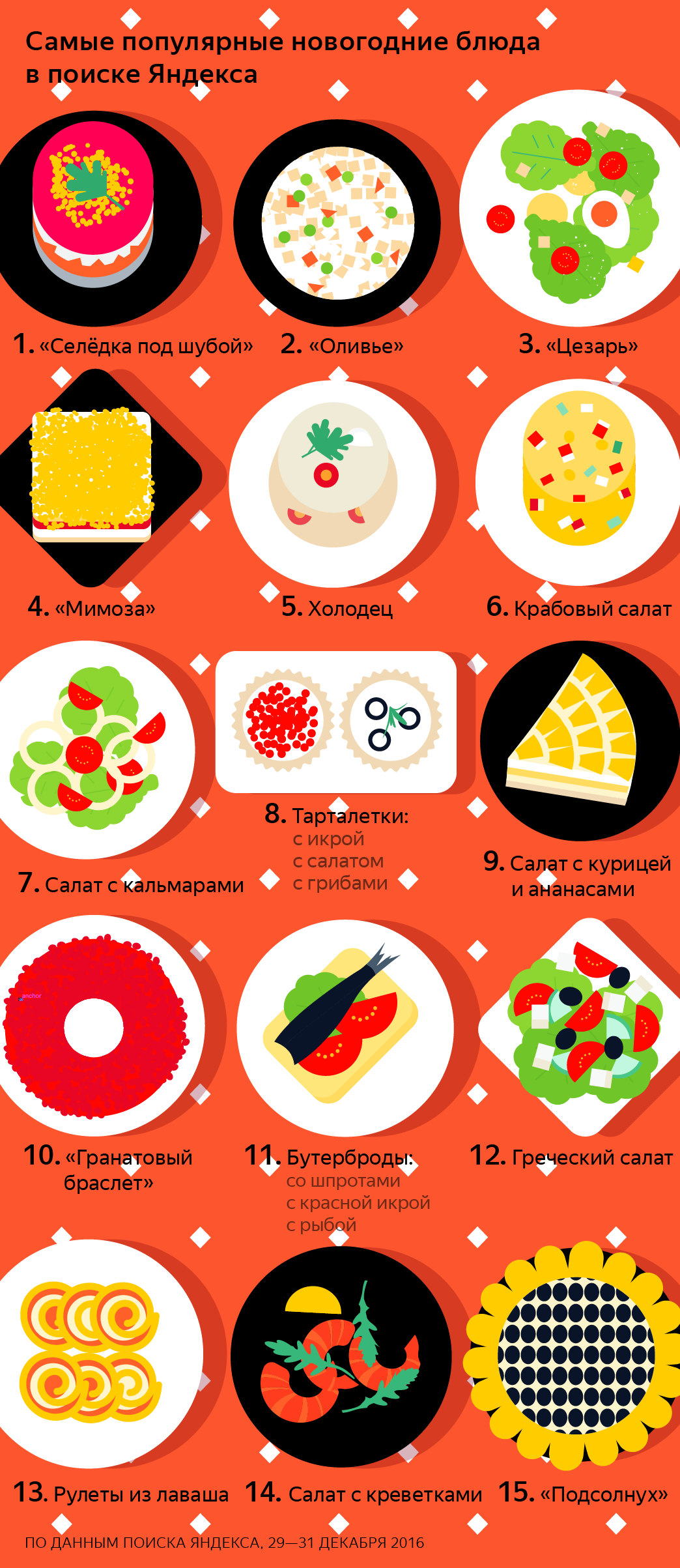 В прошлом году за три предпраздничных дня Яндекс ответил почти на семь миллионов запросов со словом «салат». Если предположить, что каждый такой запрос приводит к приготовлению хотя бы двух-трёх килограммов салата, получится больше пятнадцати тысяч тонн. Самый популярный салат — «Селёдка под шубой».