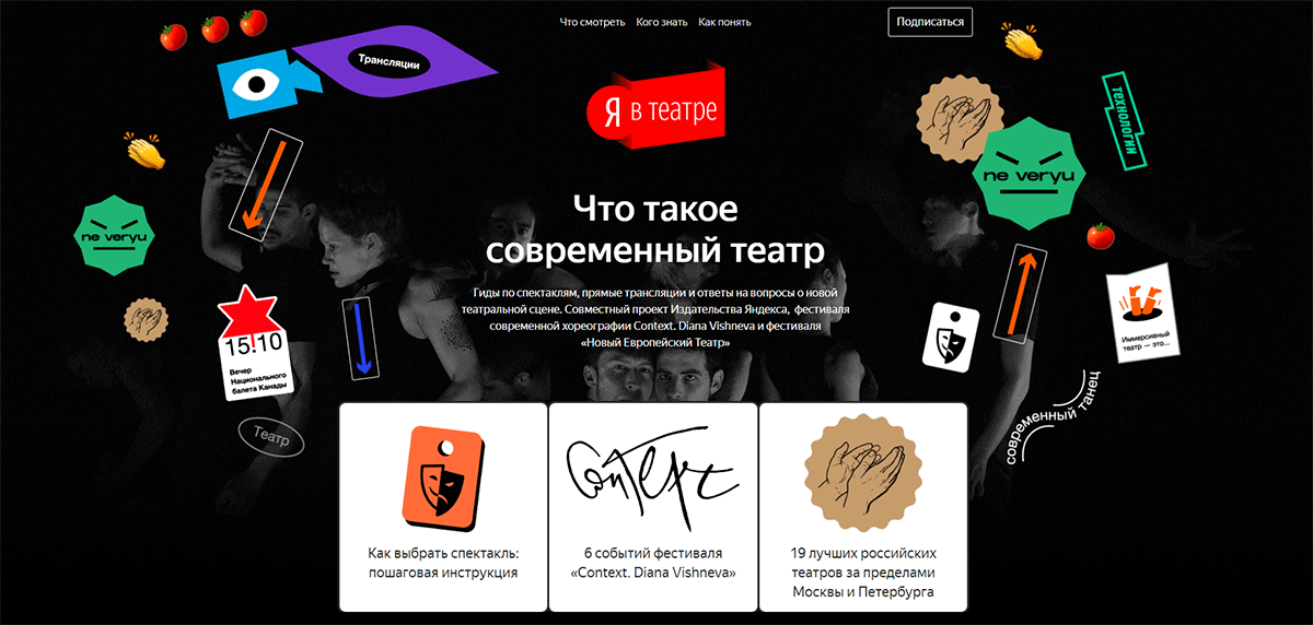 Издательство Яндекса запускает проект «Я в театре». Он посвящён современному театру и создан совместно с фестивалями Context. Diana Vishnеva и «NET — Новый Европейский Театр», которые пройдут этой осенью в Москве и Петербурге.